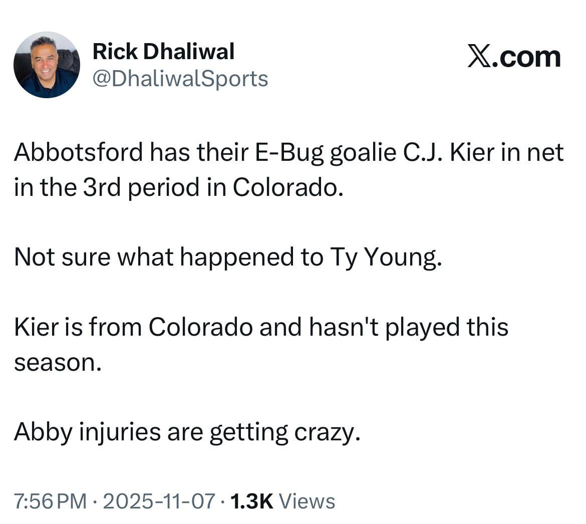The injuries continue: Emergency backup goalie C.J. Kier now in net for the Abby Canucks (Dhaliwal).