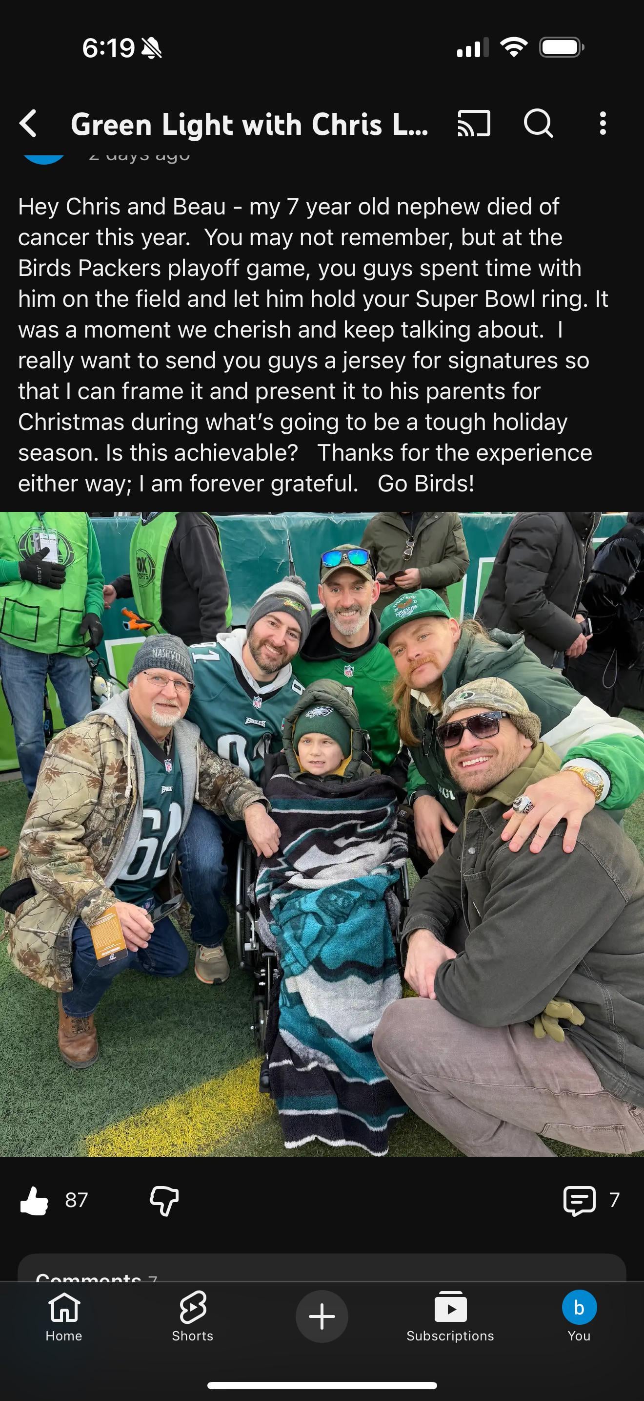 Hey bird gang. Picture says it all, but I’m running short on time against the holidays and want to ask if anyone knows another way to send a message to Beau and Chris? My post got noticed by the podcast community but not anyone on the Greenlight podcast themselves. (I posted the pic above to their YouTube community) I have a custom jersey I wanted to mail the guys to sign and I’d get it framed to present it to my nephew’s parents this Christmas. Any ideas would be greatly appreciated. Much love to everyone over the last year that supported my nephew with donations and well wishes. Although he lost the battle this year, the war against pediatric cancer is far from over. Fuck cancer and Go birds! 🦅