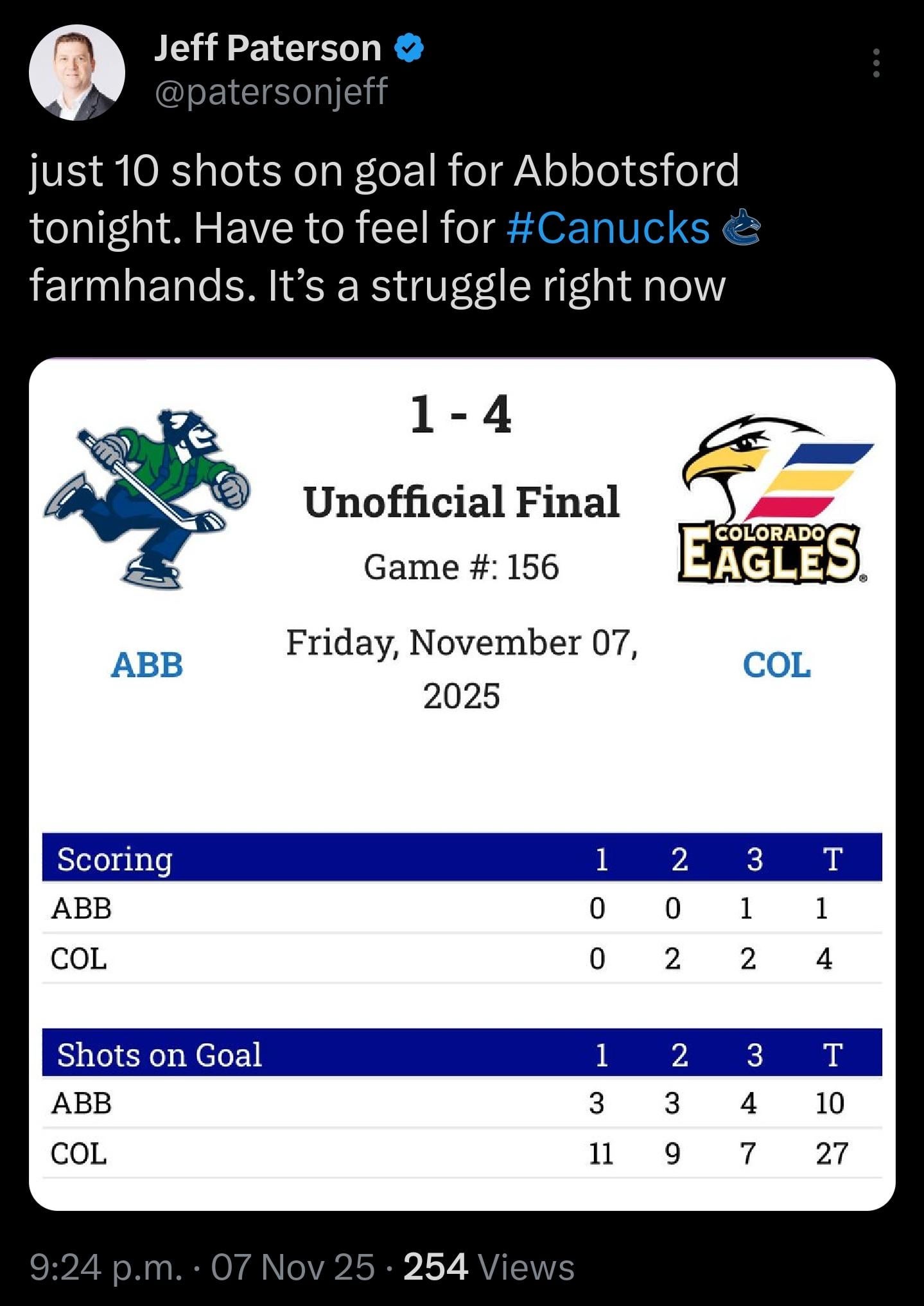 [Paterson] just 10 shots on goal for Abbotsford tonight. Have to feel for Canucks farmhands. It’s a struggle right now 7 comments Not too shabby If the Canucks win a cup in my lifetime I’ll gladly watch 10 shot games with a damn smile on my face I mean that’s the point of a farm team. To have guys you can use in case of situations like ours Evander kane matched the entire Abby team for shots in his last games LOL https://i.redd.it/qk7femh4yyzf1.gif The entire organization is in shambles To go from the Calder Cup to this is just painful 😭 Leave a ReplyYou must be logged in to post a comment.