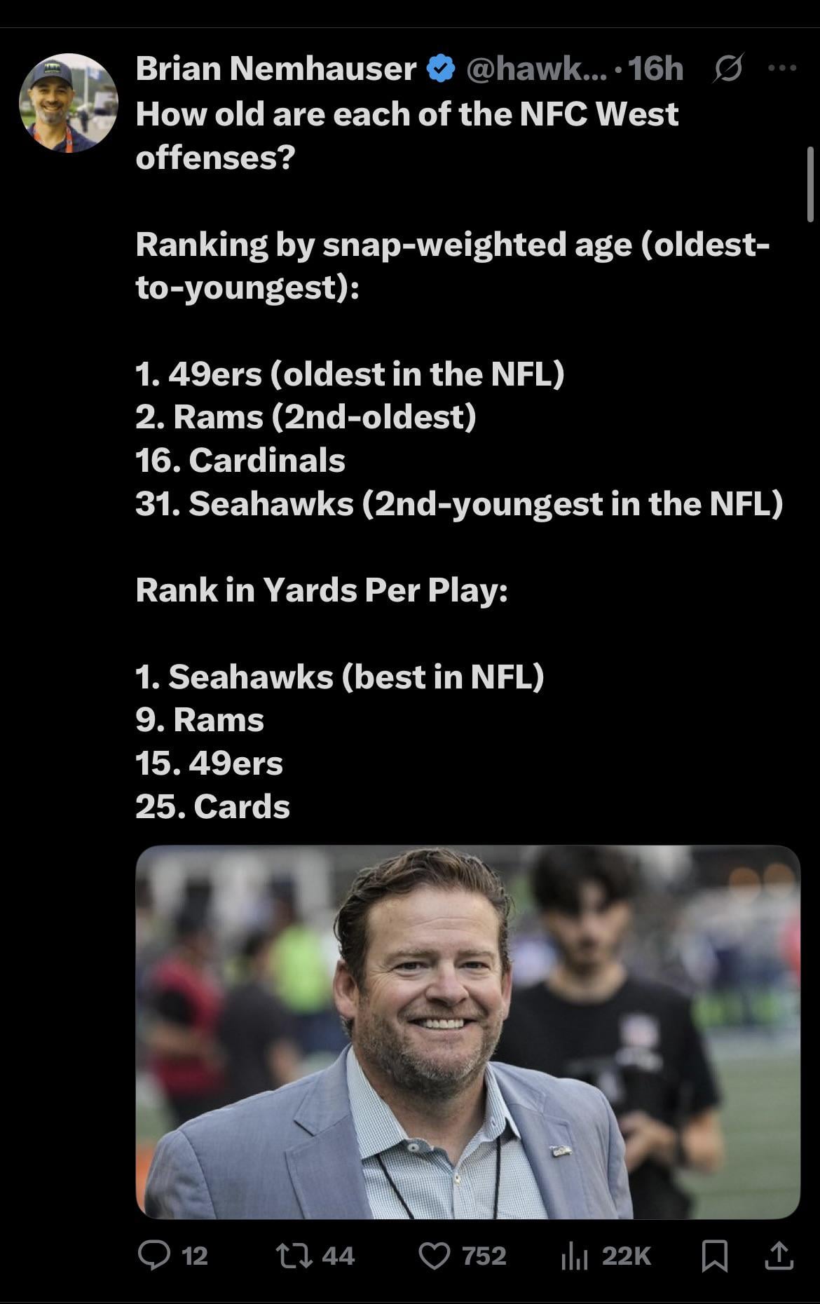 Wonder how much Stafford weights down the offensive age average, because their RB core is young. Maybe adding Adams with Nacua, and Higbee isn’t young anymore. I knew the 9ers were old tho