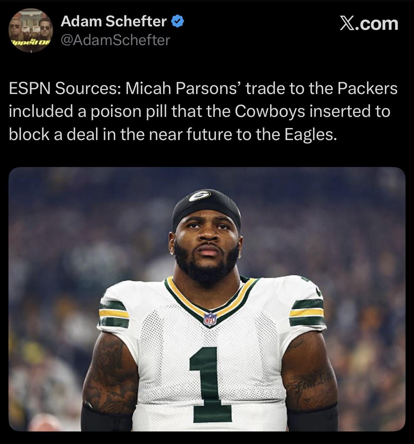 [Schefter] ESPN Sources: Micah Parsons’ trade to the Packers included a poison pill that the Cowboys inserted to block a deal in the near future to the Eagles.