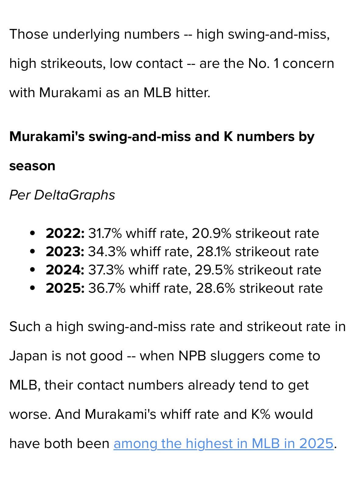Hitters like Seiya and Yoshida added 6-8% to their strikeout rate when they came over. That would make Murakami nearly unplayable.