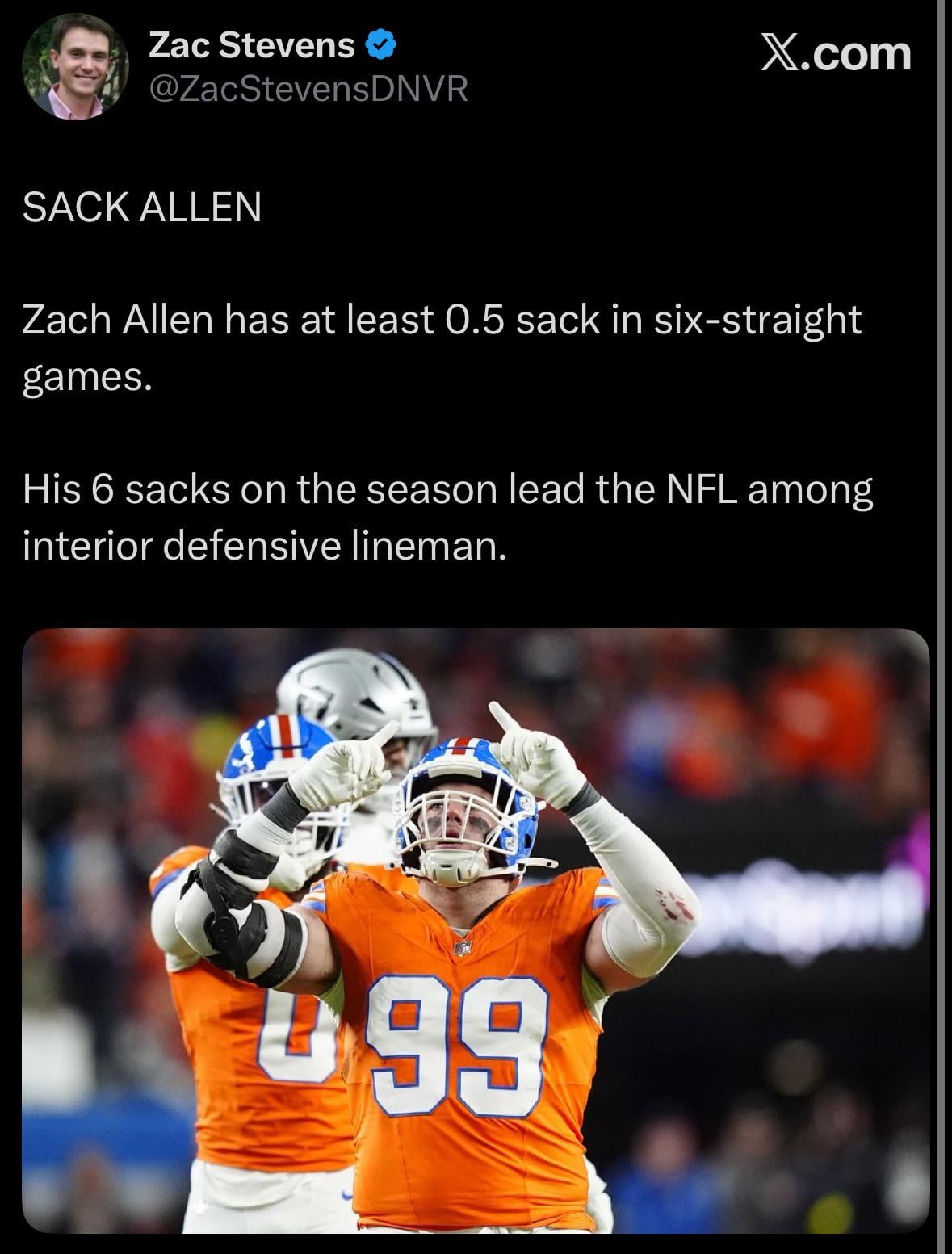 [Stevens] SACK ALLEN Zach Allen has at least 0.5 sack in six-straight games. His 6 sacks on the season lead the NFL among interior defensive lineman.