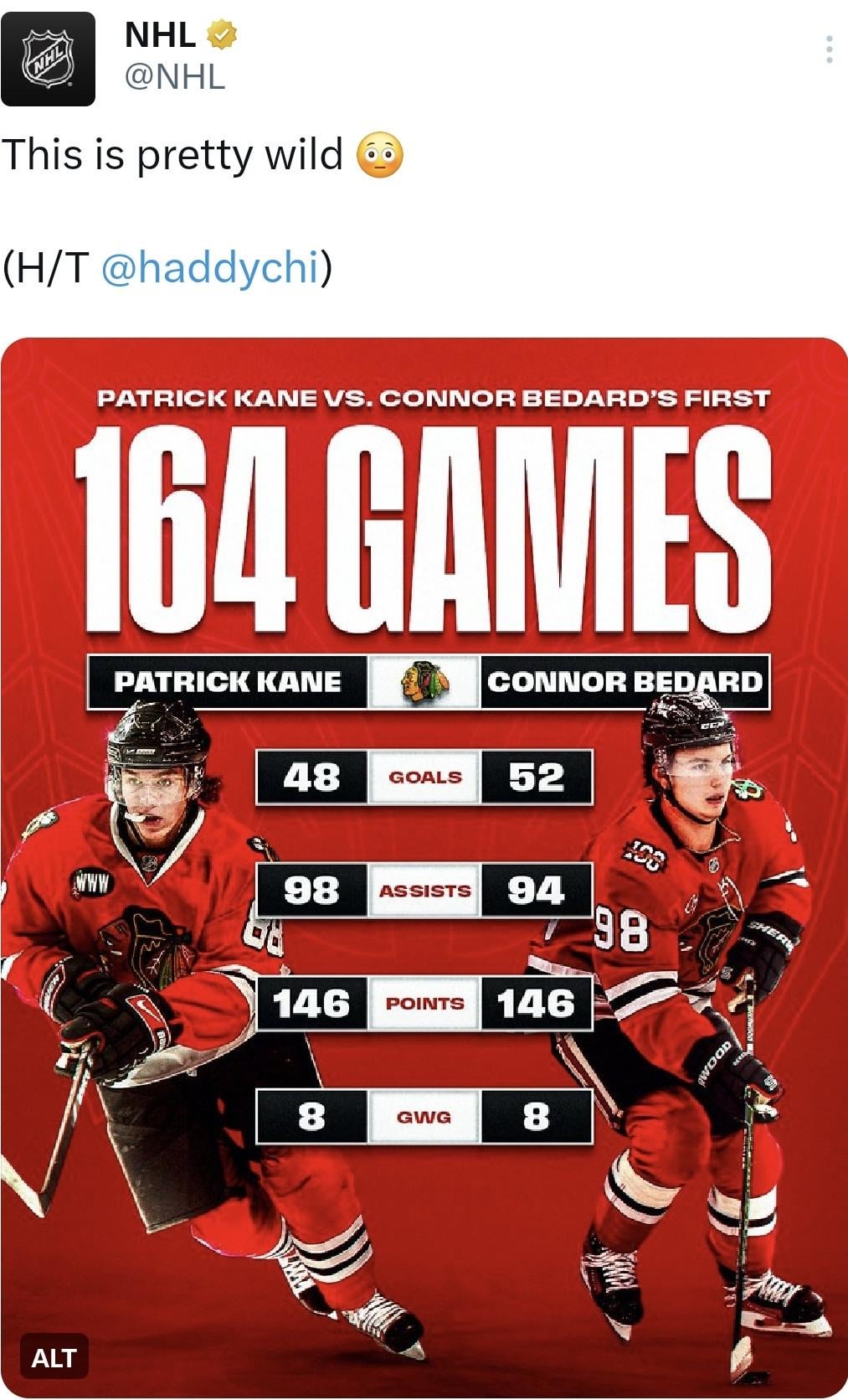[NHL] Bedard vs Kane – Tied with 146 pts in first 164 gp in NHL with Blackhawks