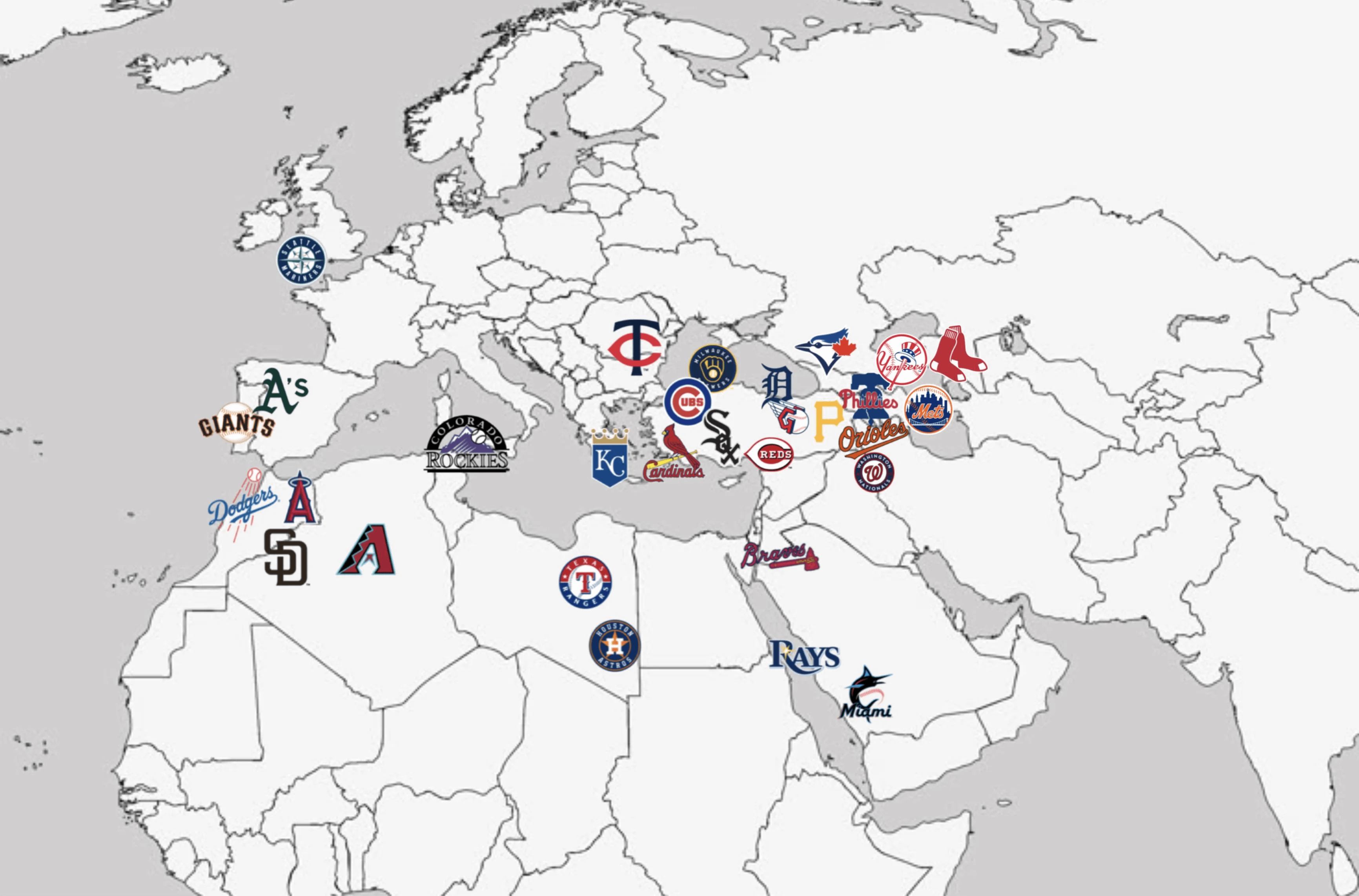 This doesn’t look remotely correct. Seattle is only about 180 miles further north than Minneapolis but on this map it’s showing the Mariners in the UK and the Twins almost in the Mediterranean Sea.