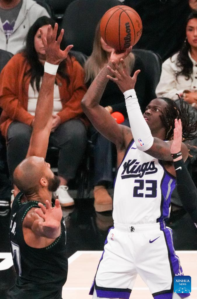 Keon Ellis (R) of Sacramento Kings shoots during the 2025-2026 NBA regular season match between Sacramento Kings and Minnesota Timberwolves in Sacramento, the United States, Nov. 9, 2025. (Photo by Sun Yuxuan/Xinhua)