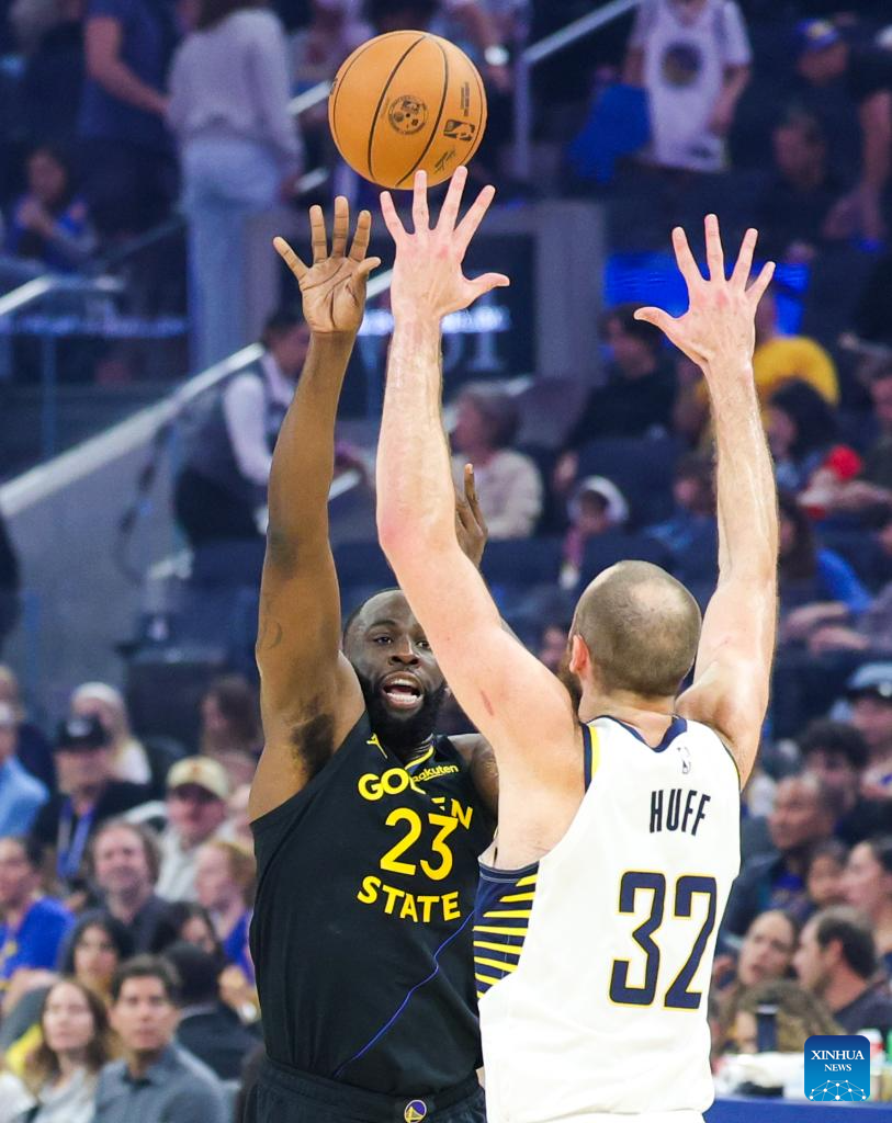 Draymond Green (L) of Golden State Warriors shoots during the 2025-2026 NBA regular season match between Golden State Warriors and Indiana Pacers in San Francisco, the United States, on Nov. 9, 2025. (Photo by Arthur Dong/Xinhua)