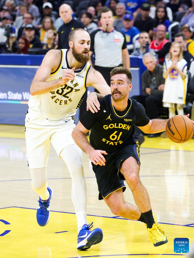 Quinten Post (front L) of Golden State Warriors competes during the 2025-2026 NBA regular season match between Golden State Warriors and Indiana Pacers in San Francisco, the United States, on Nov. 9, 2025. (Photo by Arthur Dong/Xinhua)