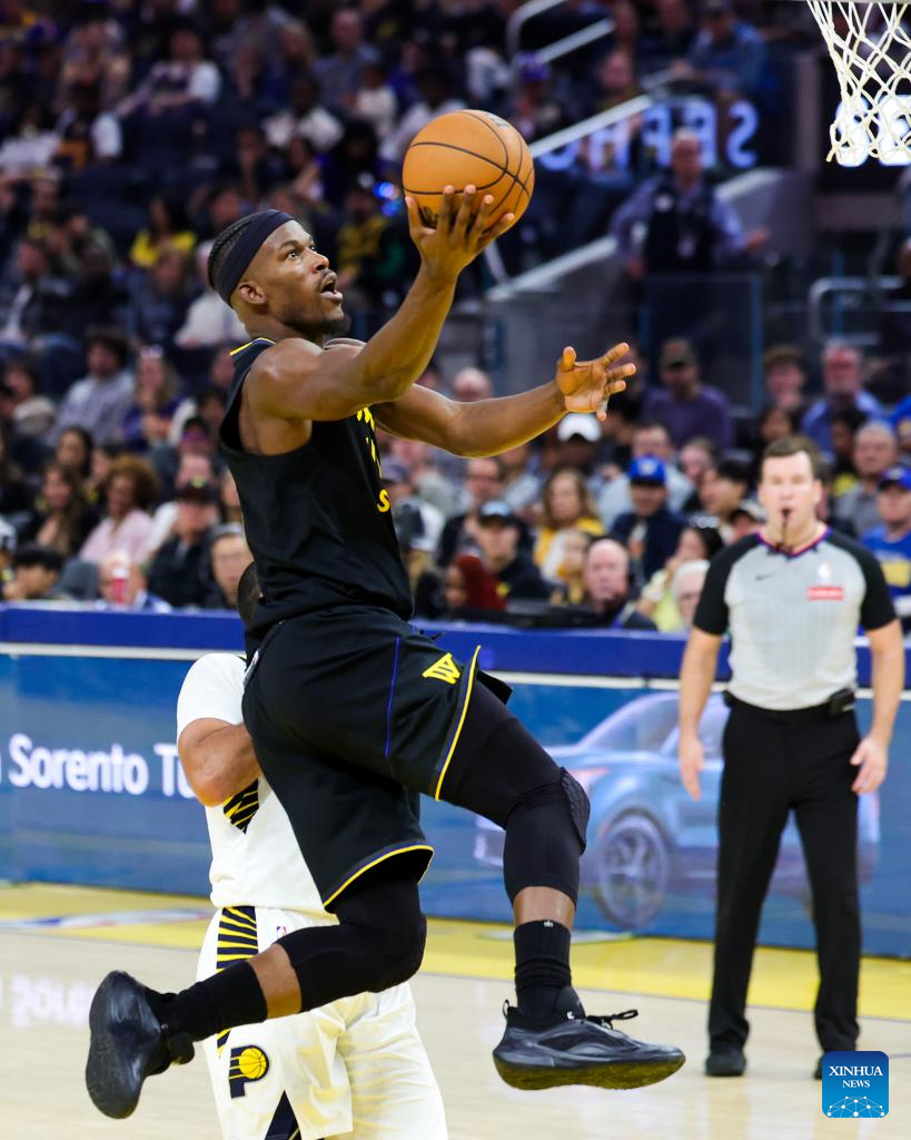 Jimmy Butler III (1st R) of Golden State Warriors goes for a layup during the 2025-2026 NBA regular season match between Golden State Warriors and Indiana Pacers in San Francisco, the United States, on Nov. 9, 2025. (Photo by Arthur Dong/Xinhua)