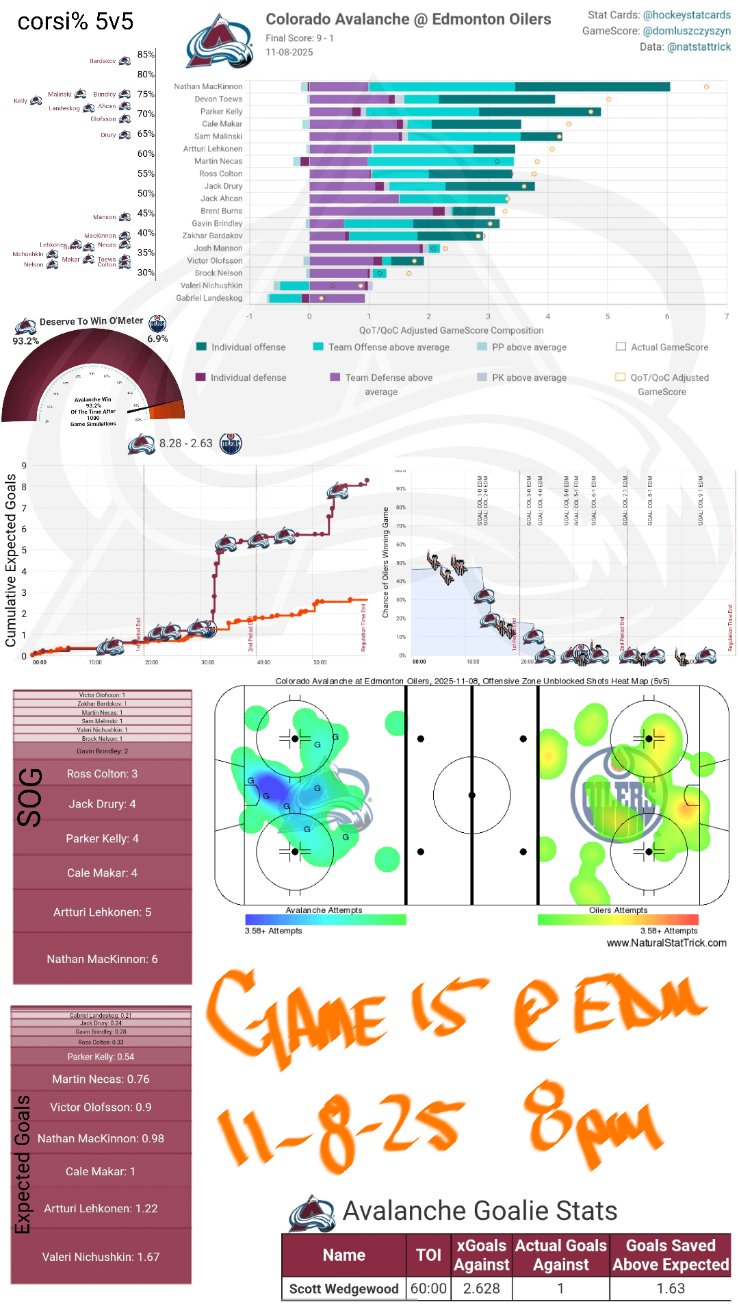 This is an insane stat card for the oilers, probably one of the most lopsided games I’ve ever seen. The only 3 Avs on the graph not performing above mcdavid is Val, Brock, and Landy