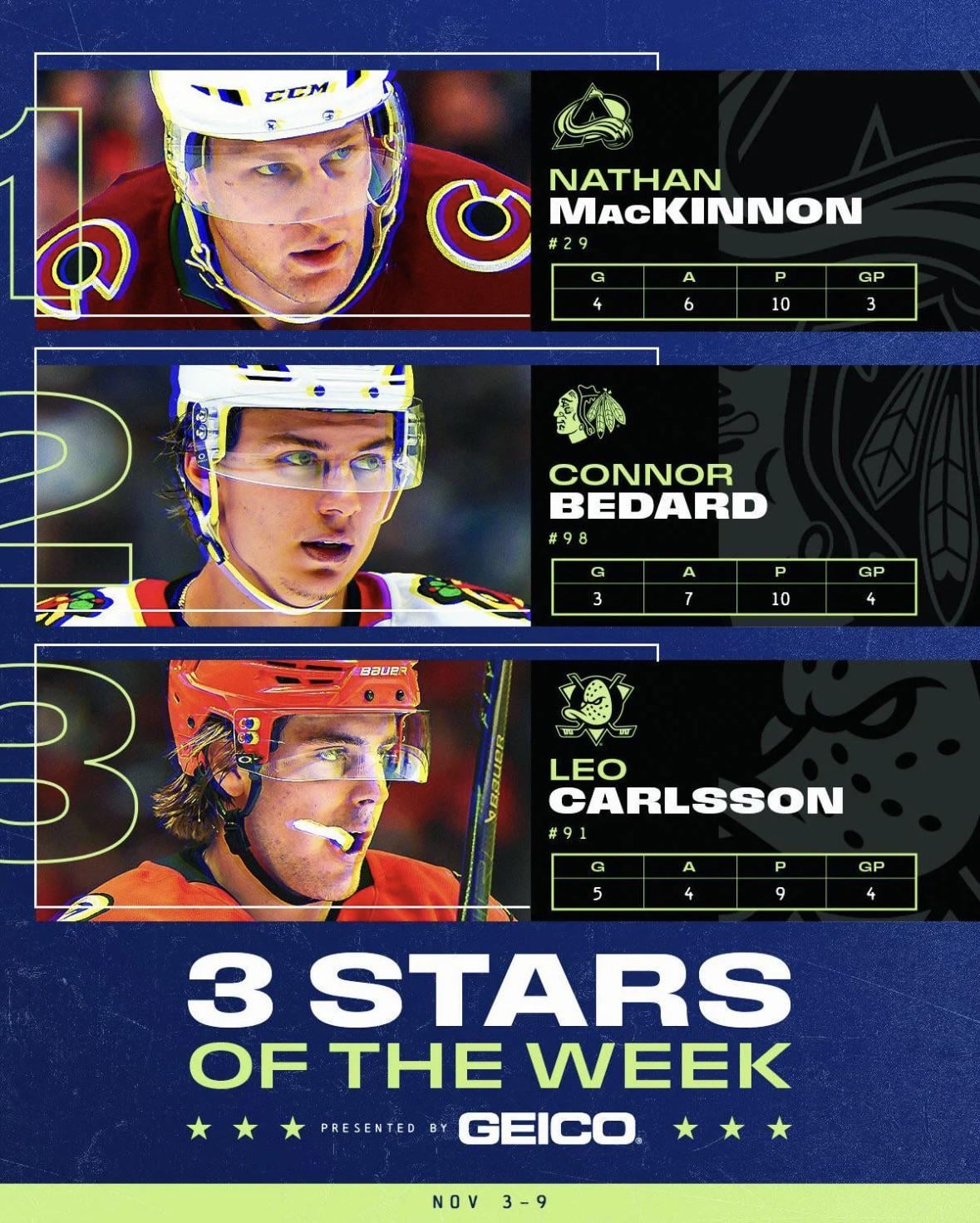 >*Bedard placed second with 3-7—10 in four appearances to lift the Blackhawks (8-5-3, 19 points) into third place in the Central Division via a trio of wins. He assisted on Chicago’s lone goal in a 3-1 loss to the Seattle Kraken Nov. 3. Bedard then registered 1-1—2 in a 5-2 triumph against his hometown team, the Vancouver Canucks, Nov. 5. He followed that with 1-3—4, his fourth career four-point performance, in a 4-0 victory over the Calgary Flames Nov. 7. At 20 years, 113 days, Bedard became the 11th-youngest player in NHL history accumulate 150 career points – a list topped by Sidney Crosby (19 years, 130 days w/ PIT). He added 1-2—3 in a 5-1 win versus the Detroit Red Wings Nov. 9 to extend his point streak to eight games dating to Oct. 26 (7-11—18), one shy of his career high set from Dec. 21, 2024 – Jan. 10, 2025 (4-8—12 in 9 GP). Bedard, the No. 1 overall pick from the 2023 NHL Draft, ranks third in the NHL with 9-16—25 through 16 total contests this season. The 2023-24 Calder Memorial Trophy winner also sits among the League leaders in assists (t-3rd; 16), even-strength points (t-4th; 17) and even-strength assists (5th; 11).*