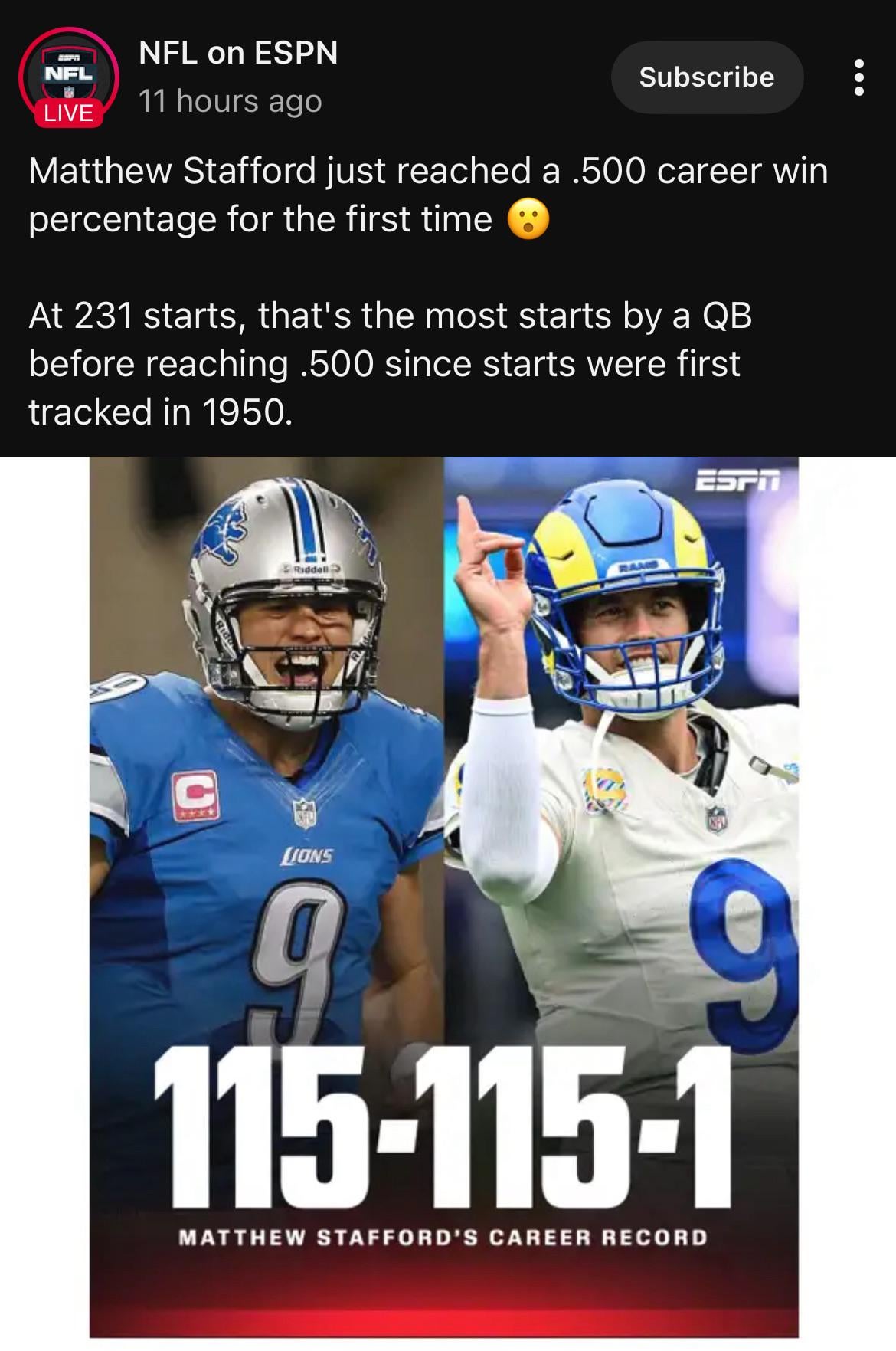 For the first time in his career, Matthew Stafford is .500 with a record of 115-115-1 4 comments What spending most of your career in Detroit does to a motherfucker I wonder what his win percentage is with the Rams Better thank McVay in his HoF speech. I mean, isn’t he still half a game BELOW .500? Have we all forgotten how to do division? Leave a ReplyYou must be logged in to post a comment.