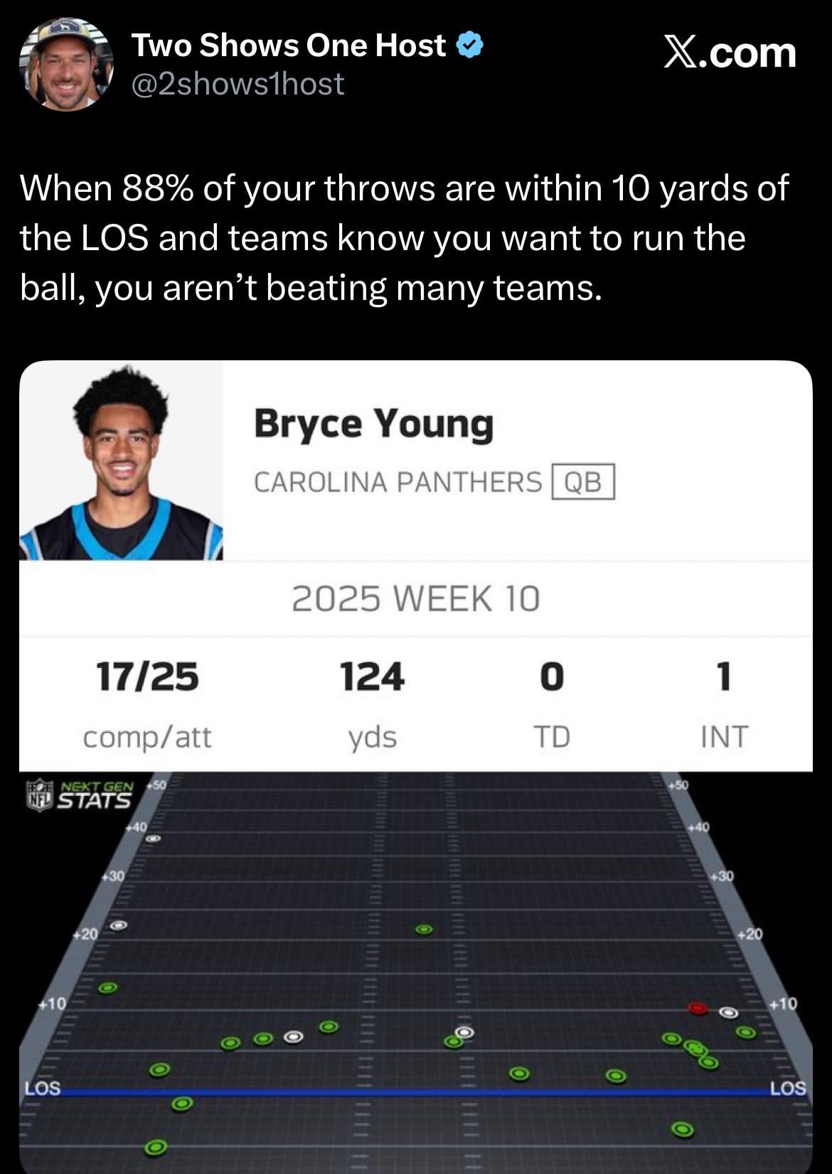 which is why I’m so annoyed we weren’t leaning on RPOs and roll outs cause not only do they help mitigate Young’s size, but it also gets him moving out of the pocket and extending plays so guys can get down field and make the play.