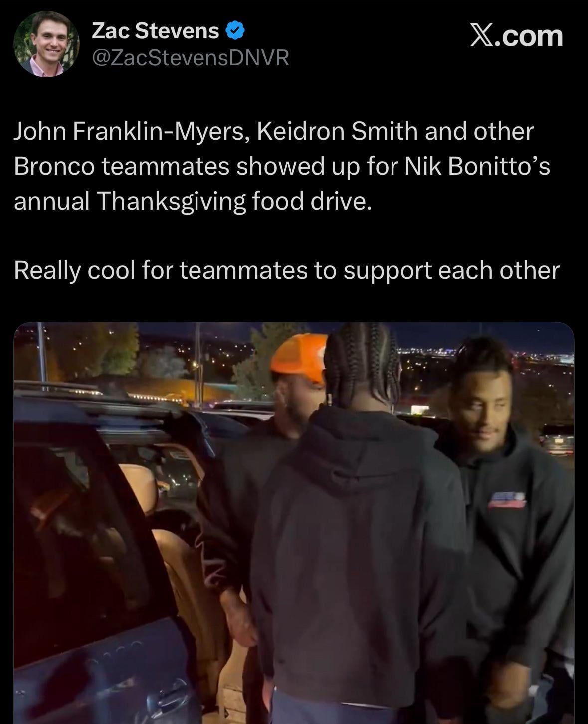 [Stevens] John Franklin-Myers, Keidron Smith and other Bronco teammates showed up for Nik Bonitto’s annual Thanksgiving food drive. Really cool for teammates to support each other