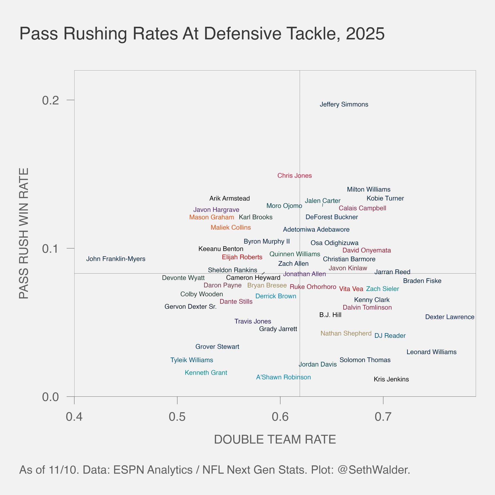 [Walder] Double team rate at defensive tackle (x) by pass rush win rate at defensive tackle (y) through yesterday’s games. 7 comments Truly having an All Pro season. And people wanted him traded. Remember when a bunch of you goobers wanted to trade him? It’s a shame we wasted a phenomenal season by Big Jeff. Hope he can keep up this level of play for future seasons. TrAde JeFf Jeff is one of three all star players on this team right now and this graph shows it. Calais Campbell is an ageless wonder. And this sub wanted him gone. Leave a ReplyYou must be logged in to post a comment.