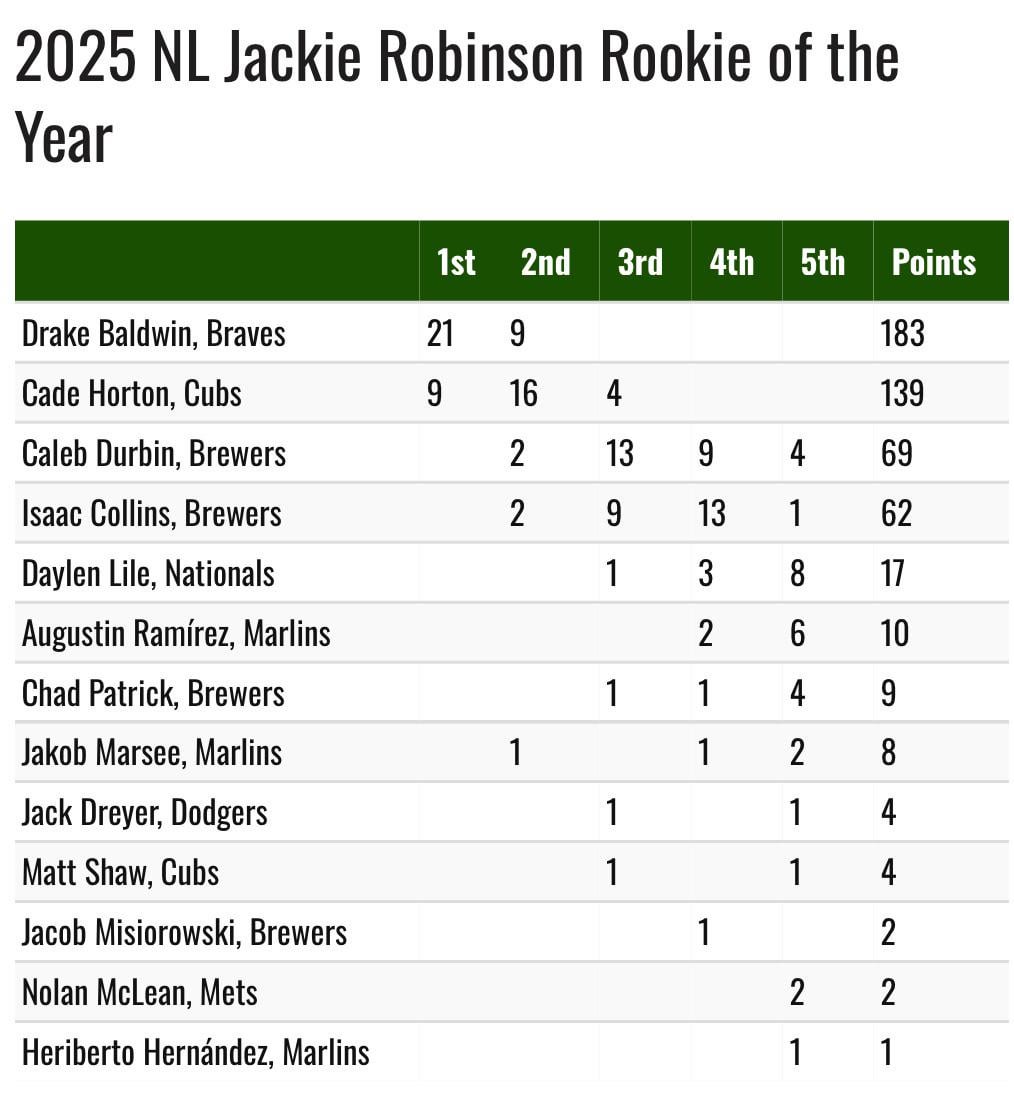 [BBWA] NL Rookie of the Year Voting Results 6 comments Good showing by our boys! And at least a sCrUB didn’t win. The future is bright! Ahh shit. Also, surprising to me that neither Caleb or Isaac got a first vote Nice, Durbin 🫡🫡🫡🫡 More Brewers than any other team. Future is bright. Leave a ReplyYou must be logged in to post a comment.