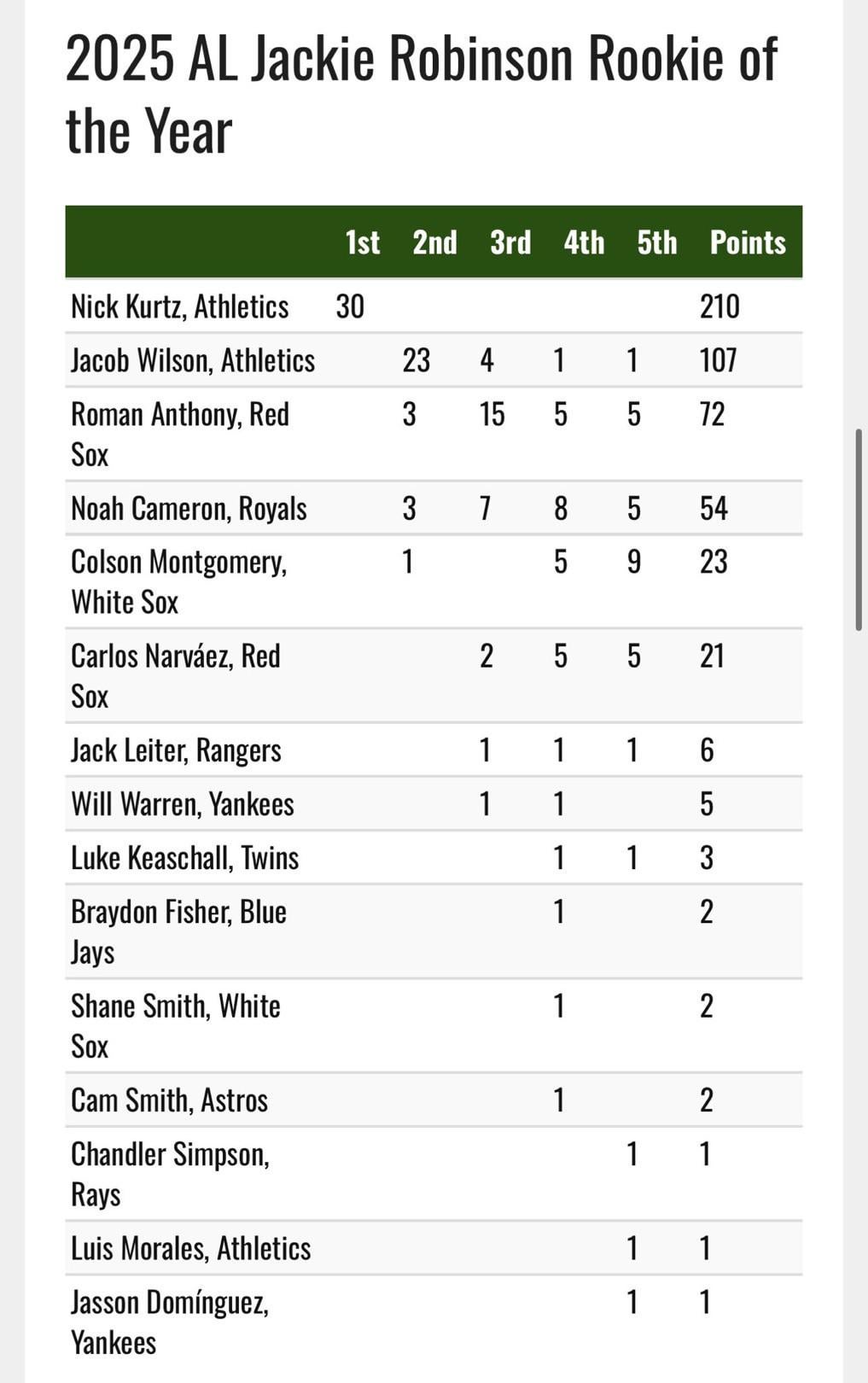 Noah Cameron got 3 second place votes in AL ROTY voting. 2 comments So do the As get 1 comp pick or 2 with Kurtz and Wilson Honestly fine with that. Kurtz and Anthony were awesome. Wilson is decent too but would the worst of the four imp. Leave a ReplyYou must be logged in to post a comment.