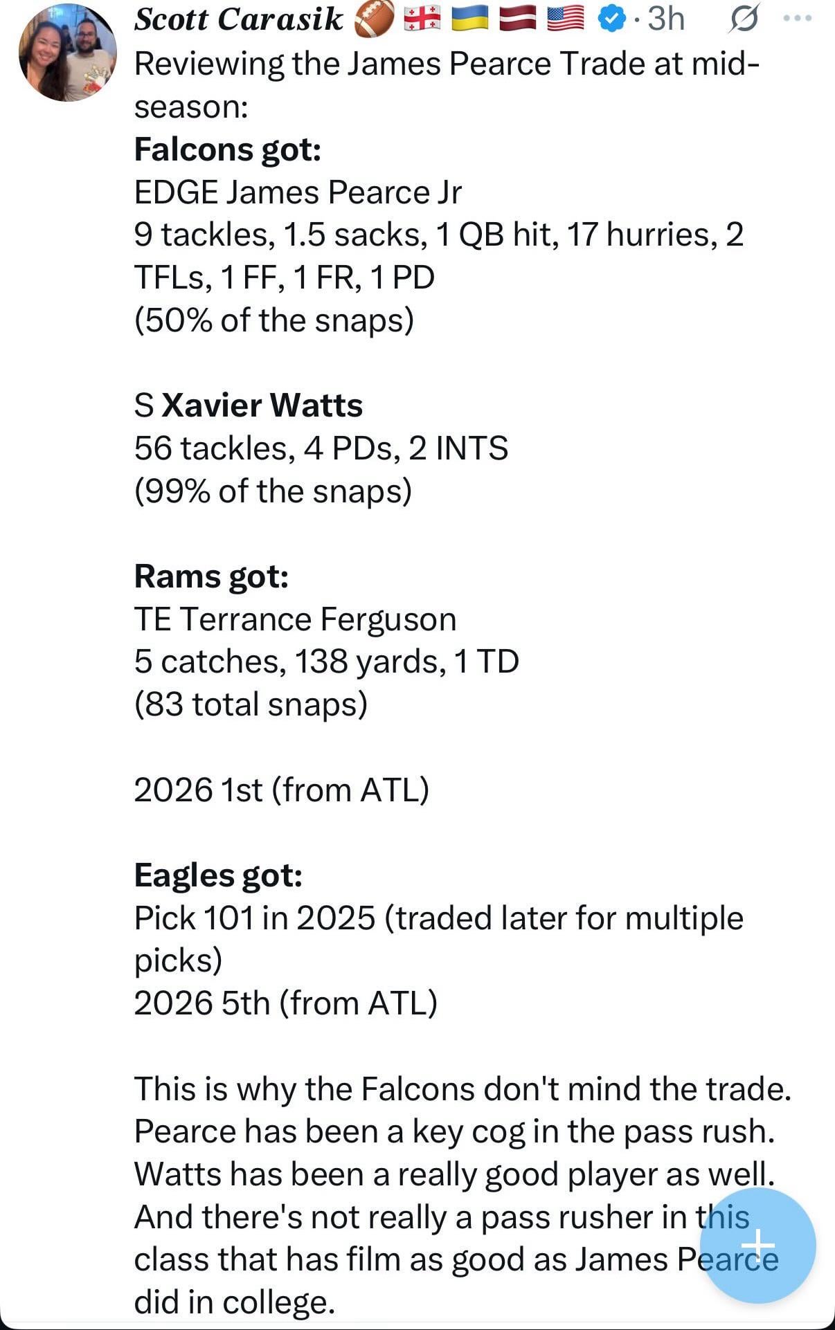 don’t regret the trade at all. the reason why this team stinks isn’t the defense, it’s the offense. And unless you have questions about Penix (which I think is fair at this point), the blame for the offense being as bad as it is lays solely at the feet of Raheem Morris and Zac Robinson. An offense with Drake London, Bijan Robinson, Tyler Algier, and the o-line talent we have should not be as bad as it is, and there is no excuse for it. And even if you’re totally out on Penix, that move was made before the 2025 draft, so it should be irrelevant to how you feel about the Pearce trade.