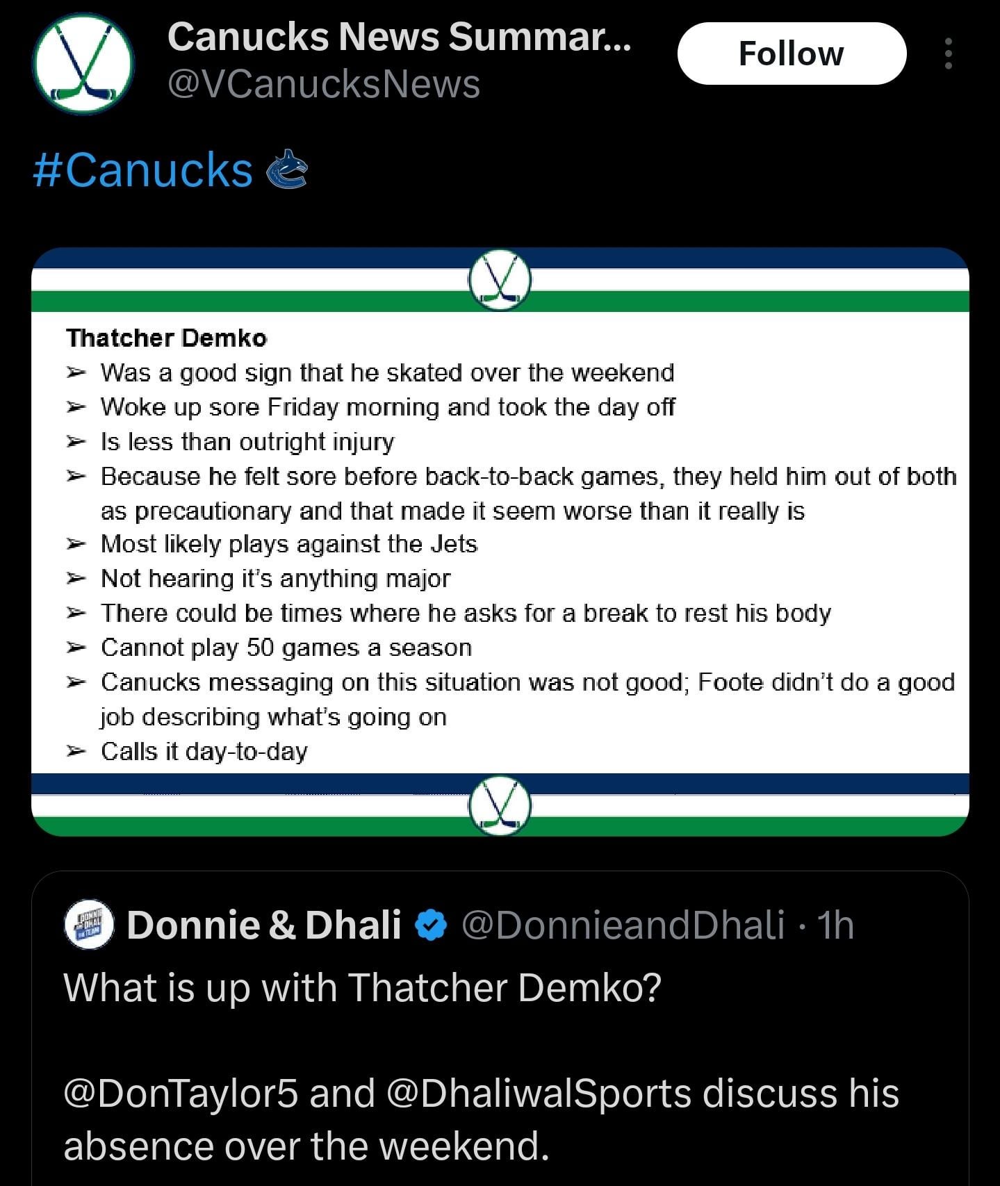 I thought that Foote was being intelligently vague. Was Demko injured? No. But to give a small insinuation that he was was necessary to bring up Petera on emergency recall.