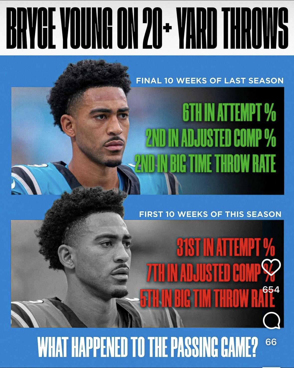 If I’m Tepper, I’m telling Dave to not worry so much about the play offs. Don’t get me wrong, by all means try to win games and keep that goal in mind. But the main priority should be trying to play a more aggressive style of offense. Sling it if we have to. Don’t be afraid to take shots. Is it crazy to say winning games by relying on Dowdle isn’t doing anything for us long term? We can be a run first team yes, but we definitely need more balance to our offense and we really need to pose more of a threat deep down the field. If we do this, I feel like we can have more of an understanding of what we need in this offense. Maybe it’s just better playmakers than the likes of XL. But my gut says it’s BY. The point I’m trying to make is we should let BY play like last year and see if he can recreate last years play or improve on it. If not, then yall in the comments gotta just give up on BY. As of now he just simply isn’t good enough.