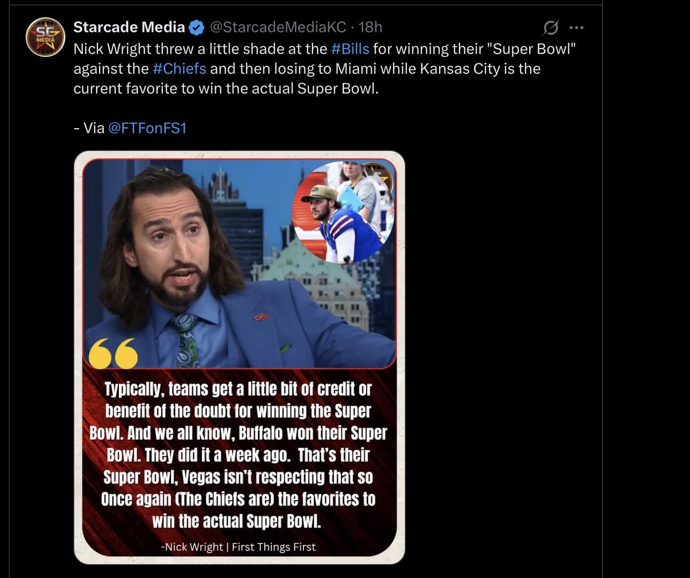 [Starcade Media] Nick Wright threw a little shade at the #Bills for winning their “Super Bowl” against the #Chiefs and then losing to Miami while Kansas City is the current favorite to win the actual Super Bowl.