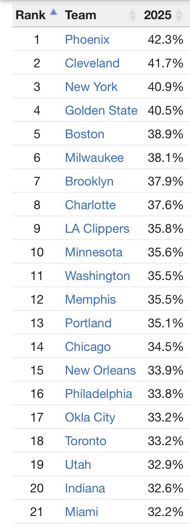 https://www.teamrankings.com/nba/stat/percent-of-points-from-3-pointers 6 comments They are bottom of the league in [points from two pointers](https://www.teamrankings.com/nba/stat/percent-of-points-from-2-pointers) It’s a good thing but also a not good thing. Cold shooting days will hurt us so badly if we can’t score inside the 3pt line. Not really a good thing. Where are they in points from free throws? Cool? That’ll happen when the team pulls up from three every other play no matter who is holding the ball lmao Leave a ReplyYou must be logged in to post a comment.