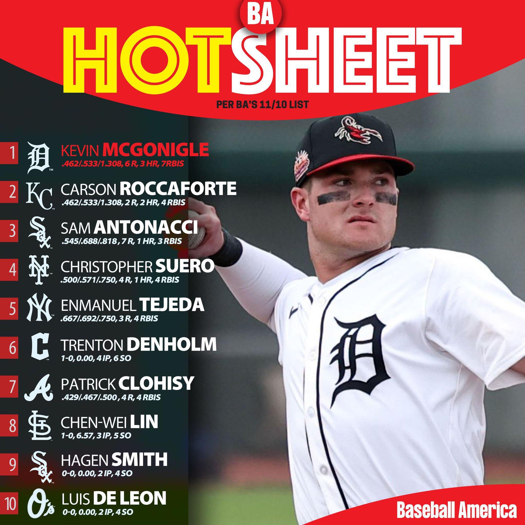>The Scoop: It took until early November for Roccaforte to finally leave the yard for the first time this fall. But when the Royals prospect found his power stroke, he didn’t stop at one. The 23-year-old went deep in back-to-back games, flashing the pop that produced 18 homers during the regular season. However, lingering swing-and-miss concerns have kept him from fully translating his power into consistent in-game production. Roccaforte is hitting .292/.407/.508 with a .915 OPS. (JC)