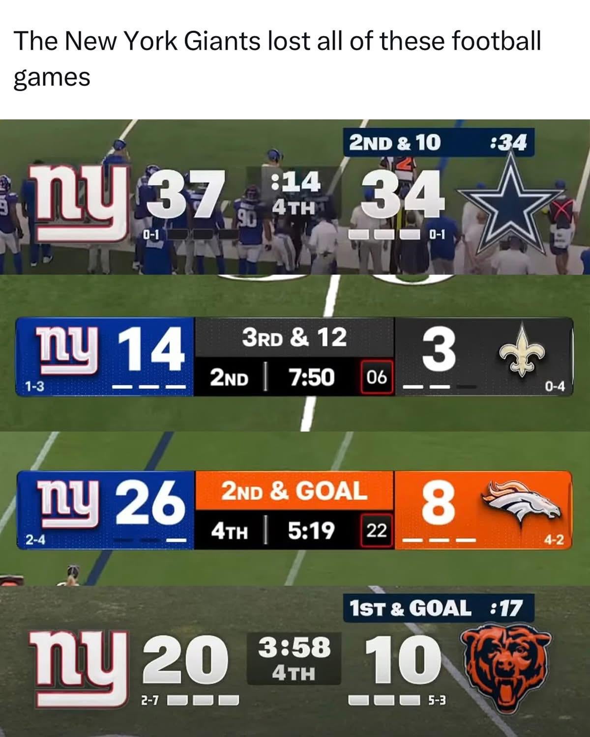 Tbf two of these were against the Broncos in the 4th quarter and the Bears in the 4th quarter. Giants are far from the only teams to fall victim to that.