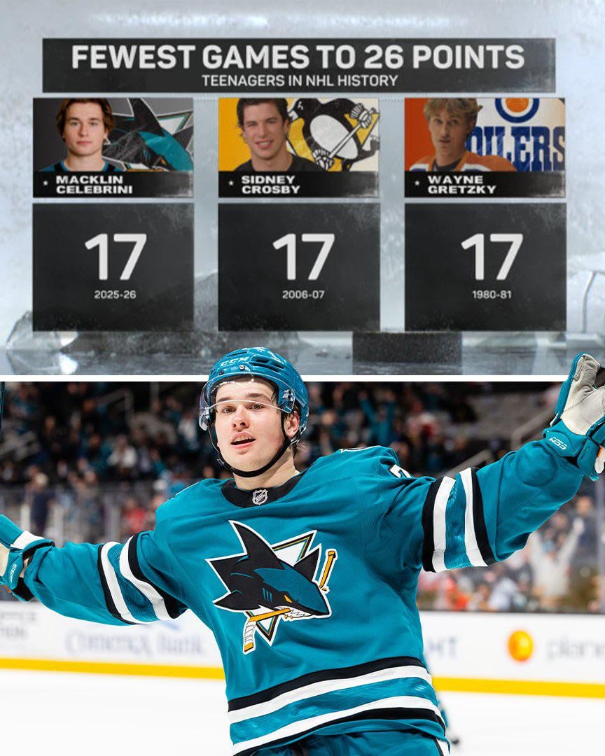 Macklin Celebrini is only 19 years old and has 26 points in 17 games during his second season in the NHL. That’s tied for the fewest games to reach 26 points by a teenager in NHL history.