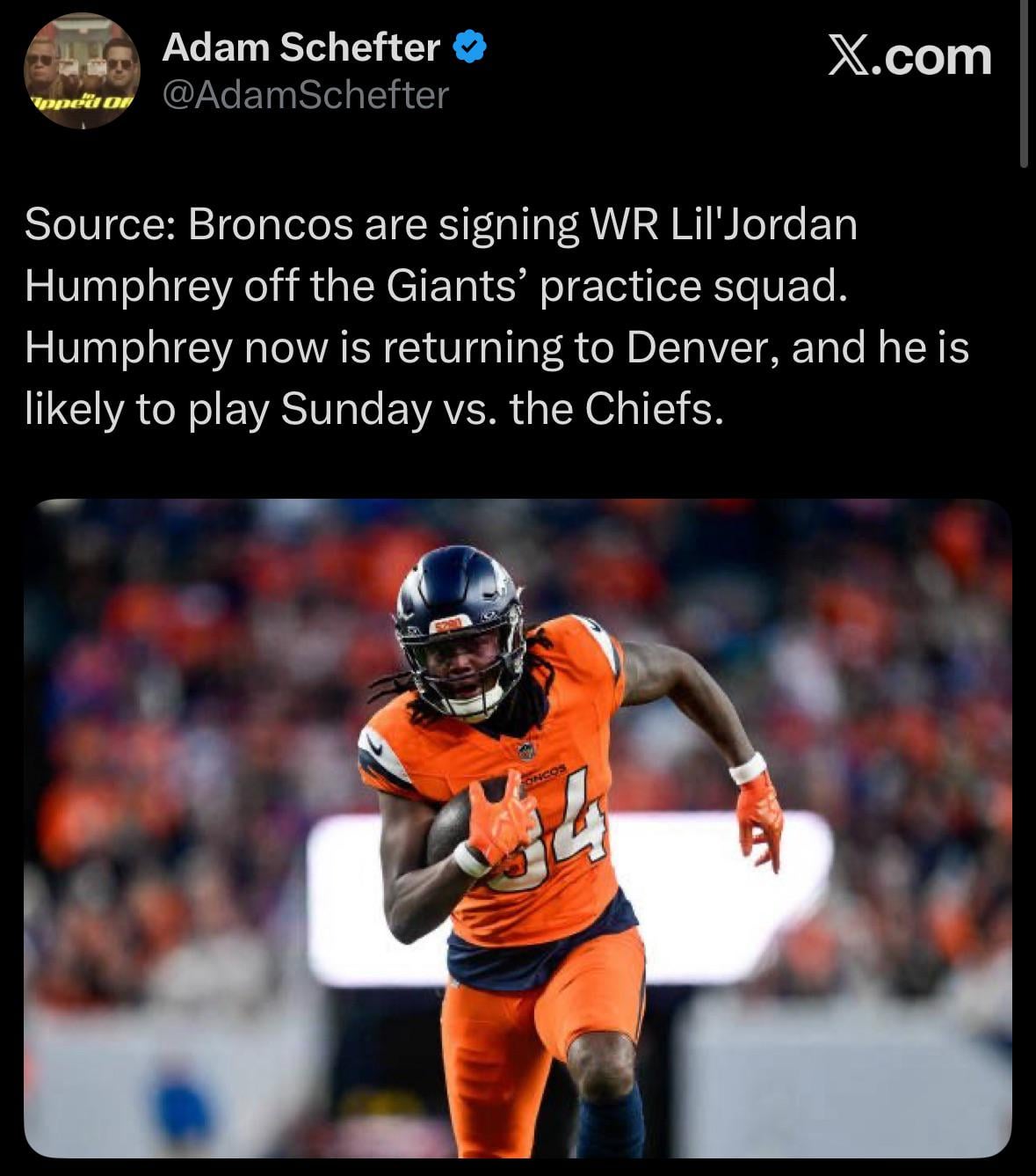 [Schefter] Source: Broncos are signing WR Lil’Jordan Humphrey off the Giants’ practice squad. Humphrey now is returning to Denver, and he is likely to play Sunday vs. the Chiefs.
