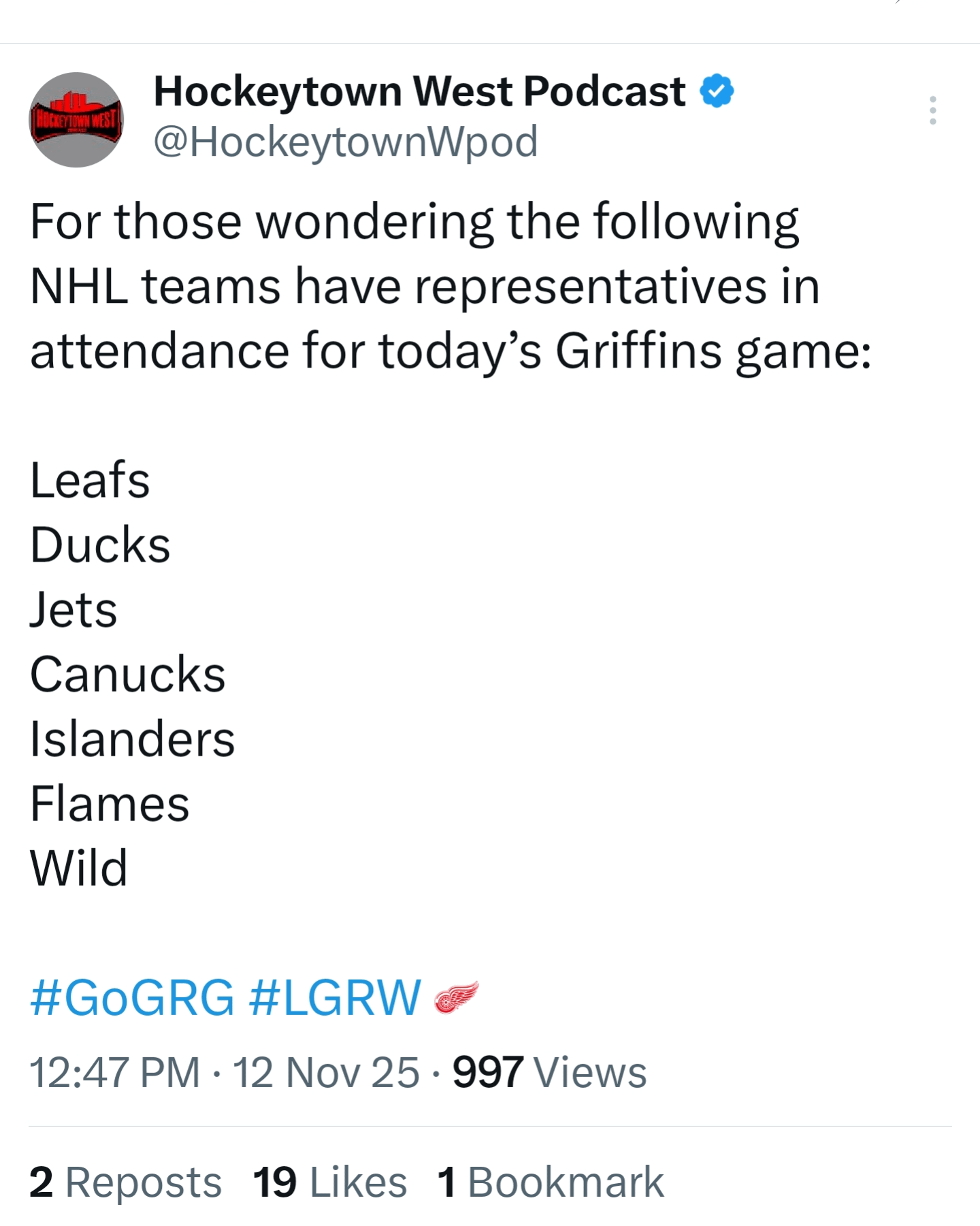 Steve Yzerman was also reported to be in attendance in Grand Rapids today. Hopefully some veteran(s) get another chance in the NHL; also Ihope Yzerman was impressed by Lombardi!