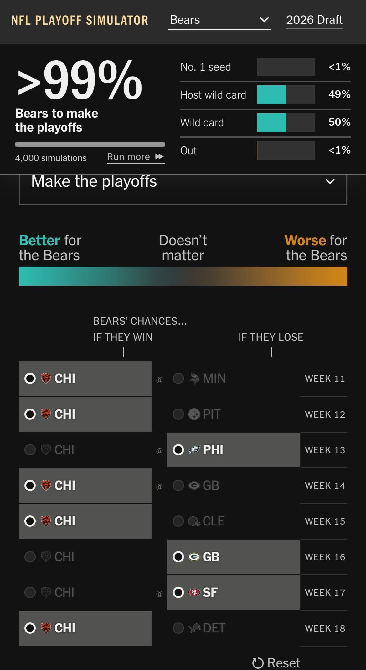 5. That 49ers game will be the deciding factor for the Bears. I took a look at their schedule and here is how it looks, they are currently 6-4: