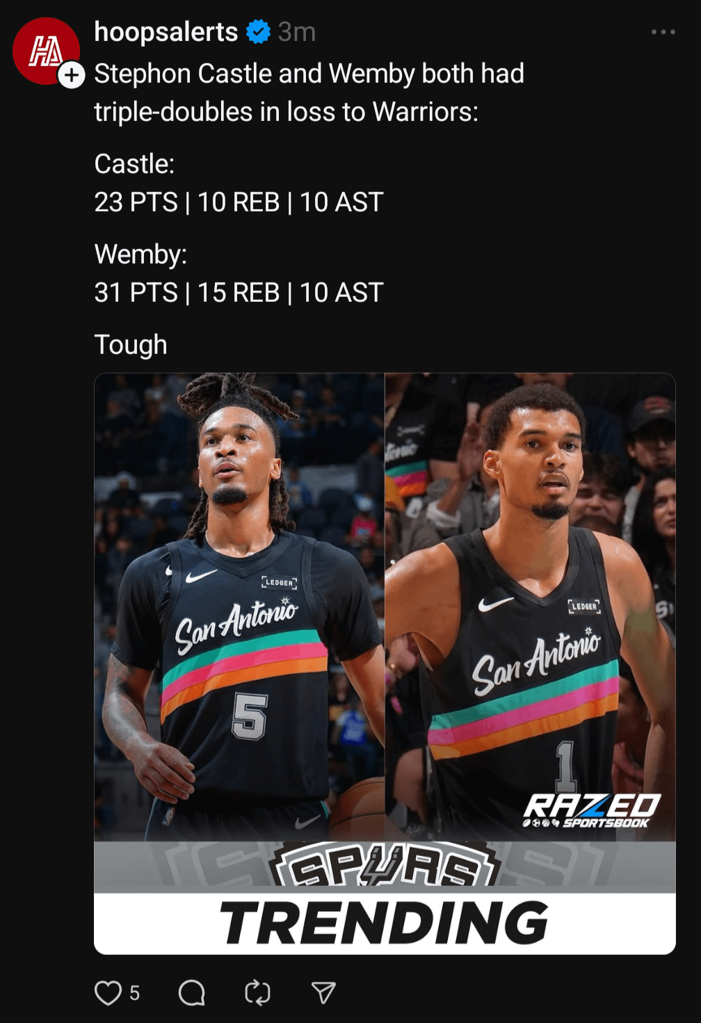 Silver lining 11 comments Elite stat padding at the end there. Wemby almost had a quad-double with TOs. Great to see. Castle foul trouble really cost us, this was the type of game I would’ve liked to have seen him play close to 40 minutes. gotta leave with something, todays L stung hard as a mf tho lol My goats never stopped fighting The haters will call it stat padding All things considered, Castle’s been really good these past games Very winnable game but we can’t win them all. Hope they make some adjustments for Friday’s matchup. 20+ turnovers is rough. Foul trouble, lack of defensive rebounds and Steph Curry = L It definitely ruined Scott Foster’s betting line. So almost as good as a win. Despite the L a double triple-double The stat padding at the end  Fox almost had a triple double of turnovers, fouls and lost defensive assignments. Leave a ReplyYou must be logged in to post a comment.