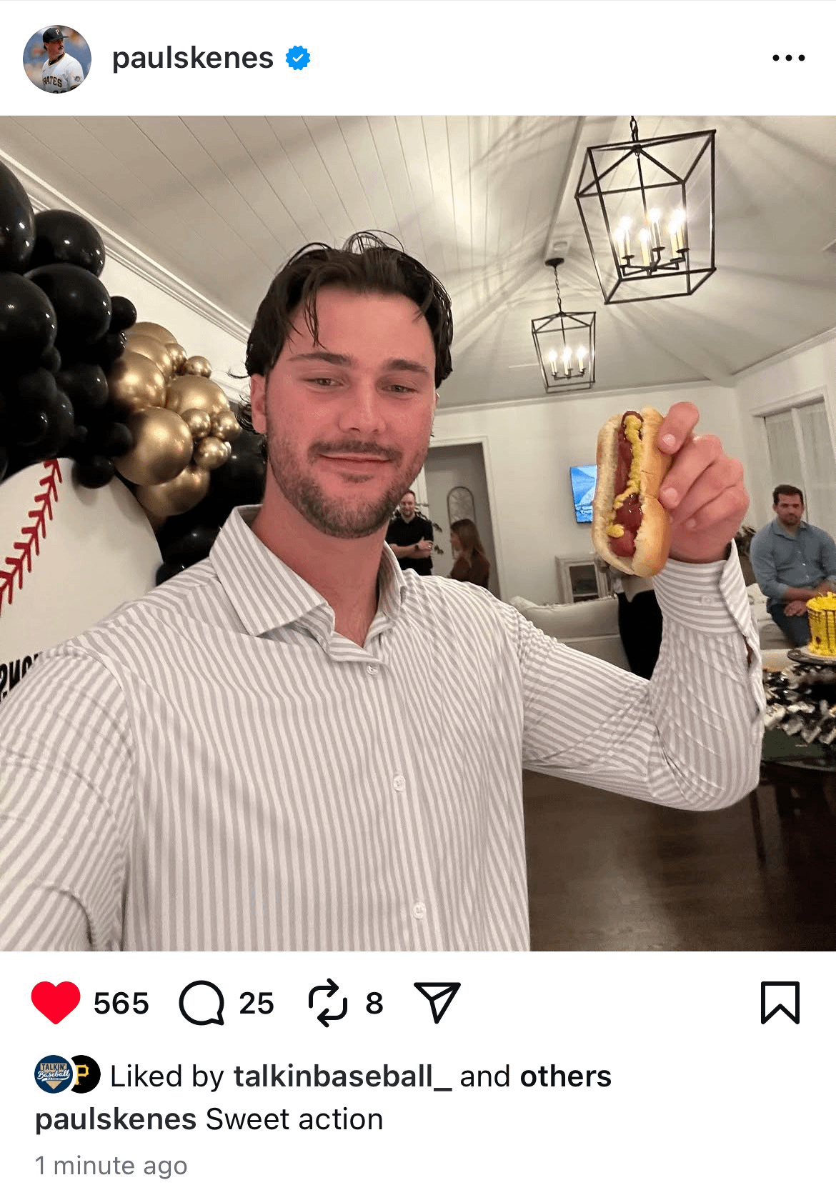Paul Skenes celebrates his Cy Young Award with a glizzy