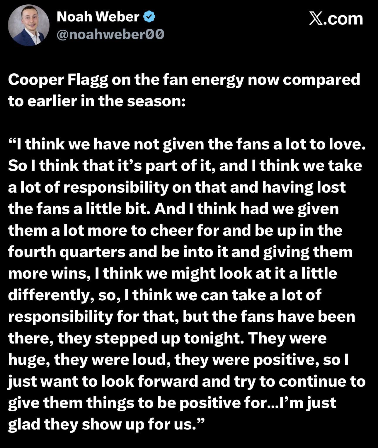 [Weber] Cooper Flagg on the fan energy now compared to earlier in the season