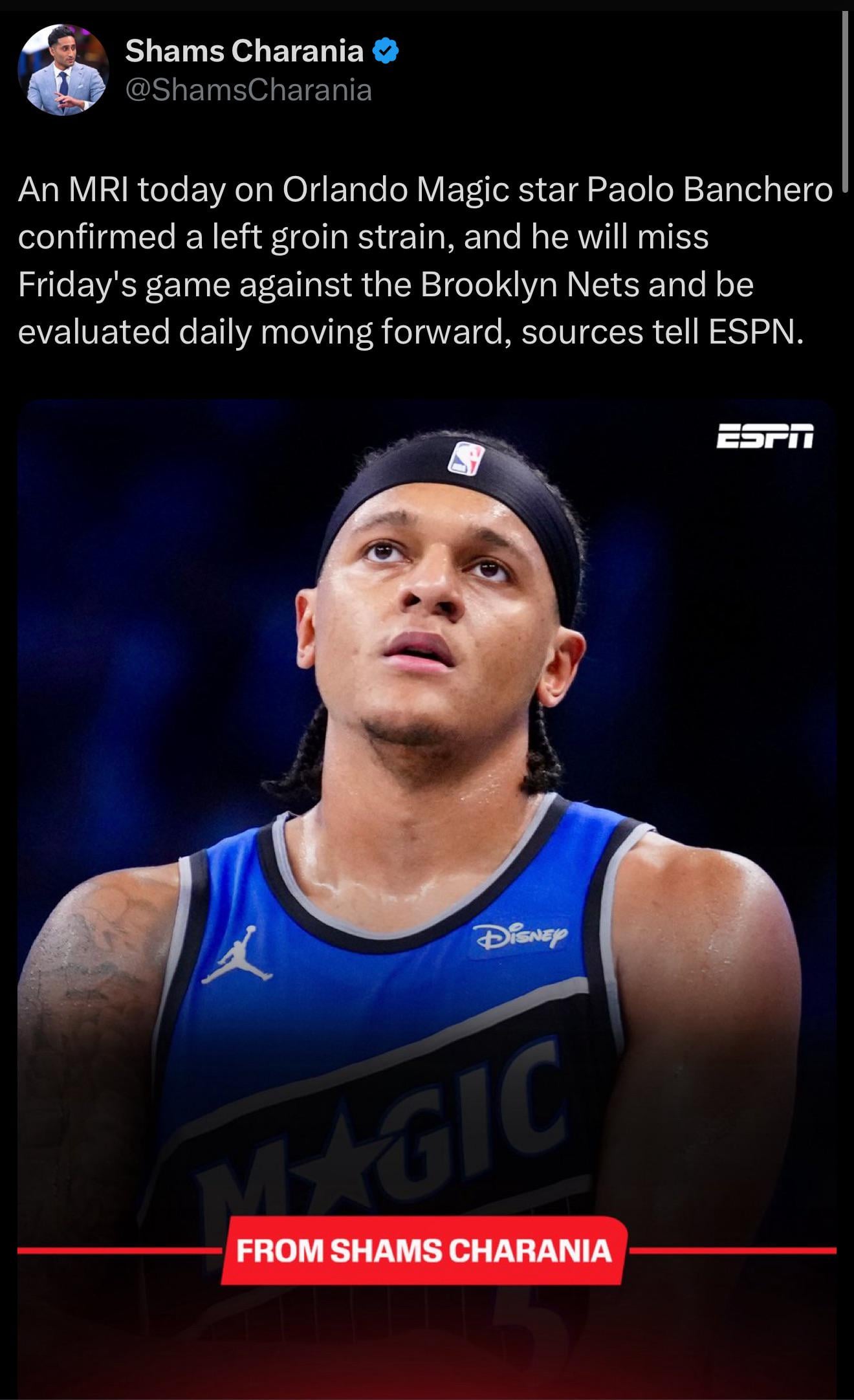 [Shams] An MRI today on Orlando Magic star Paolo Banchero confirmed a left groin strain, and he will miss Friday’s game against the Brooklyn Nets and be evaluated daily moving forward, sources tell ESPN.