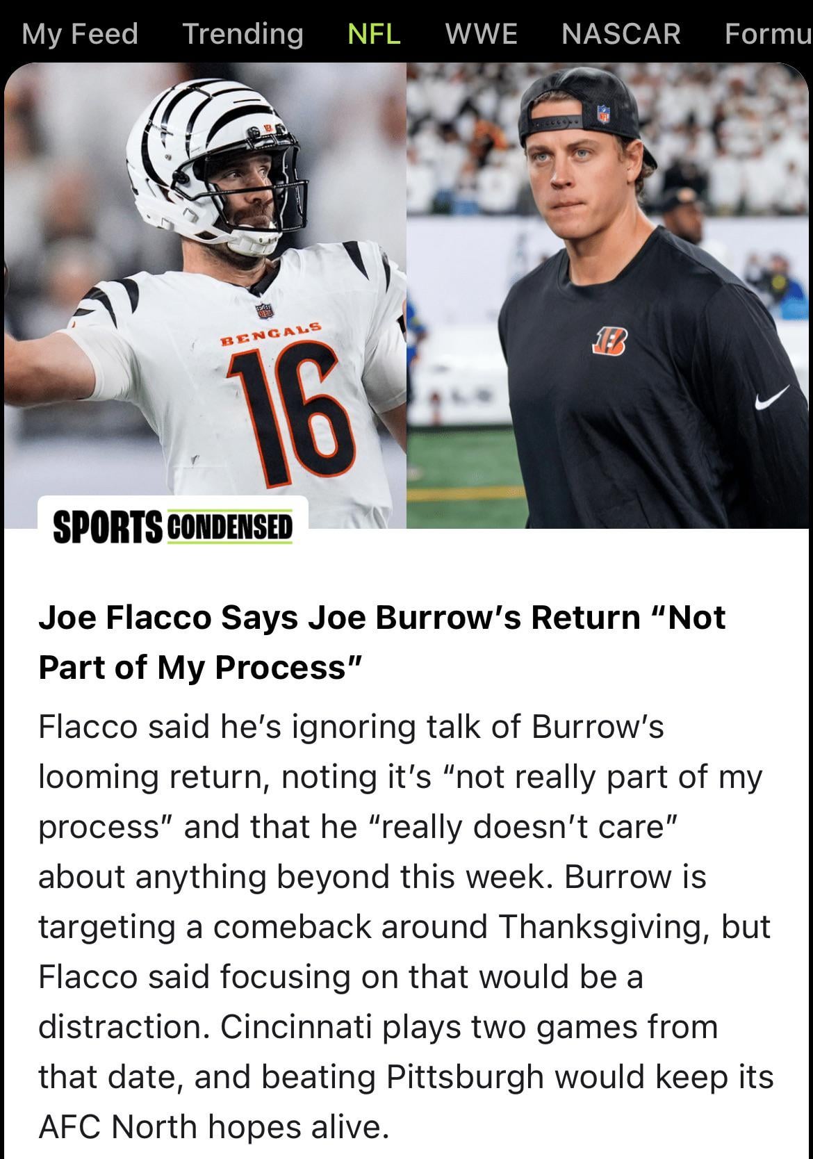 Flacco is playing really good ball for the Bengals. It’s not his fault the defense is absolutely trash and guess what Joe Burrow isn’t gonna come right in and light it up and the defense is mysteriously gonna fix itself.
