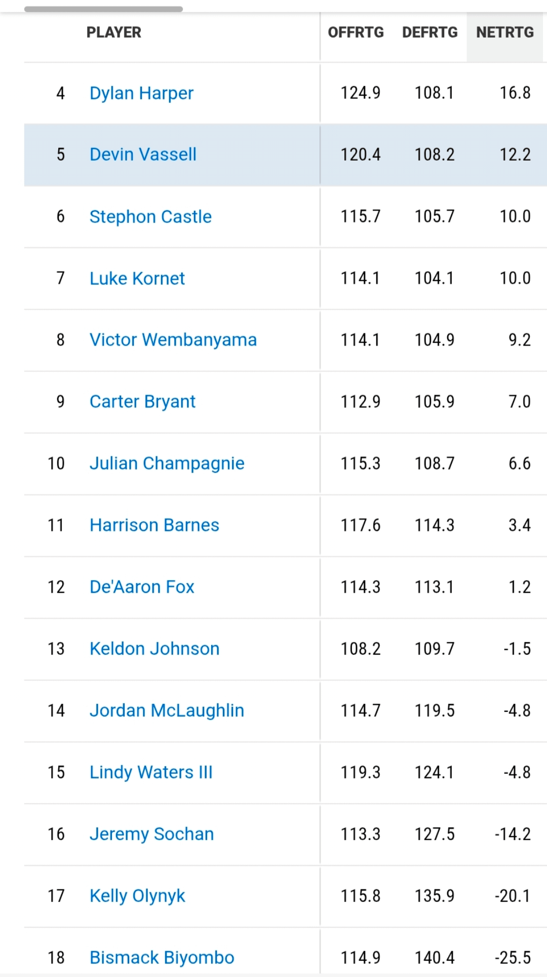 I’d like to know how much sochan has played with the top of the list if this is about him. Fox has been disappointing on defense, he doesn’t seem to be on the same page as everyone else so far. Obviously neither has played much though. And we’re like 11 games in so kinda early to say anything