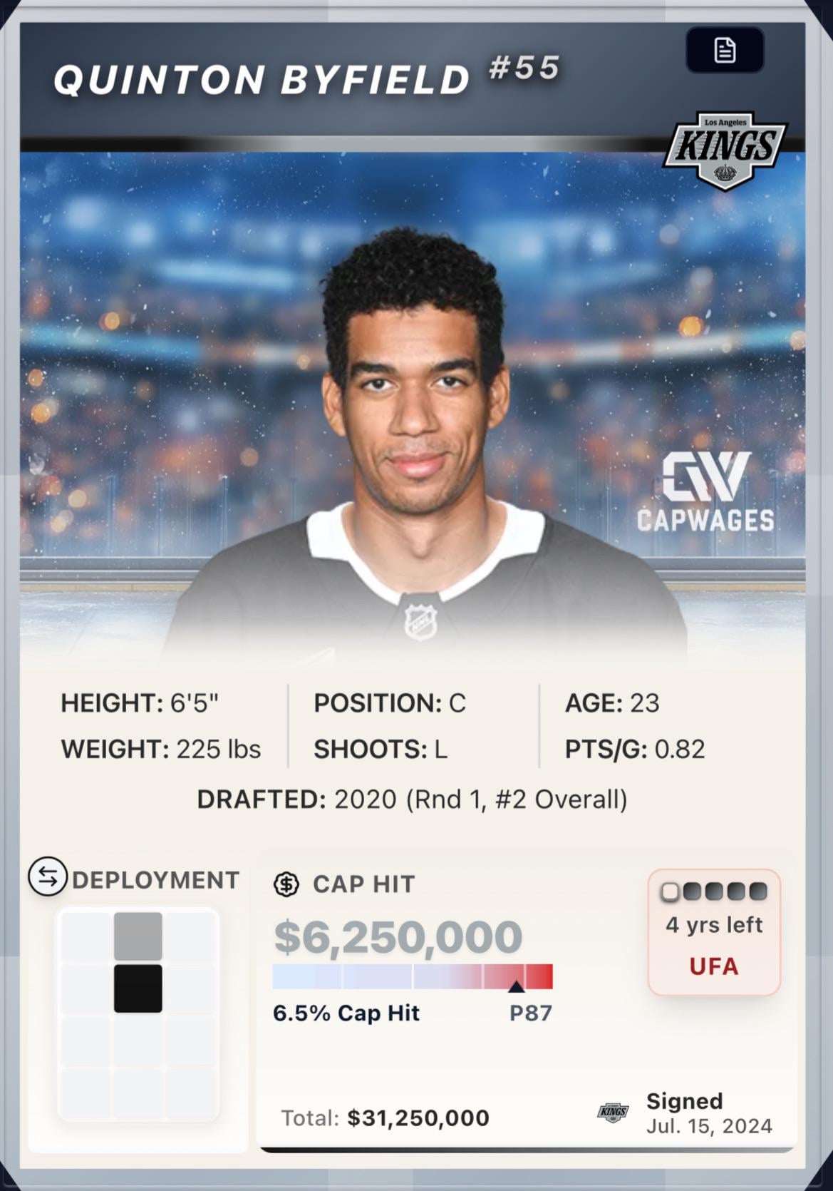 Byfield is paid as a fairly cheap 2nd line centre, and is producing over 0.8 points/game.