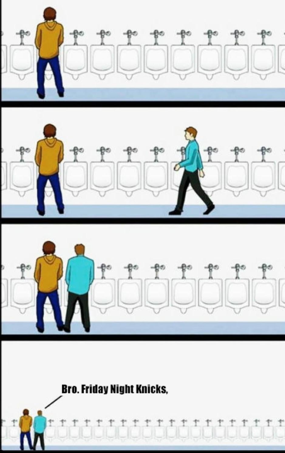 I’m Talking Friday Night Knicks 9 comments Gotta get thereeeeee The MSG urinals when you walk out before the halftime rush Play someone besides the heat or the bulls for a change Doin’ it just to get there Please understand And against the Heat with both teams with almost identical records 😍, this night has the potential of being awesome or awful, no middle point. Can piss next to me for that got front row seats Now I need to see it on YouTube; I meant RR and not some dude peeing Leave a ReplyYou must be logged in to post a comment.