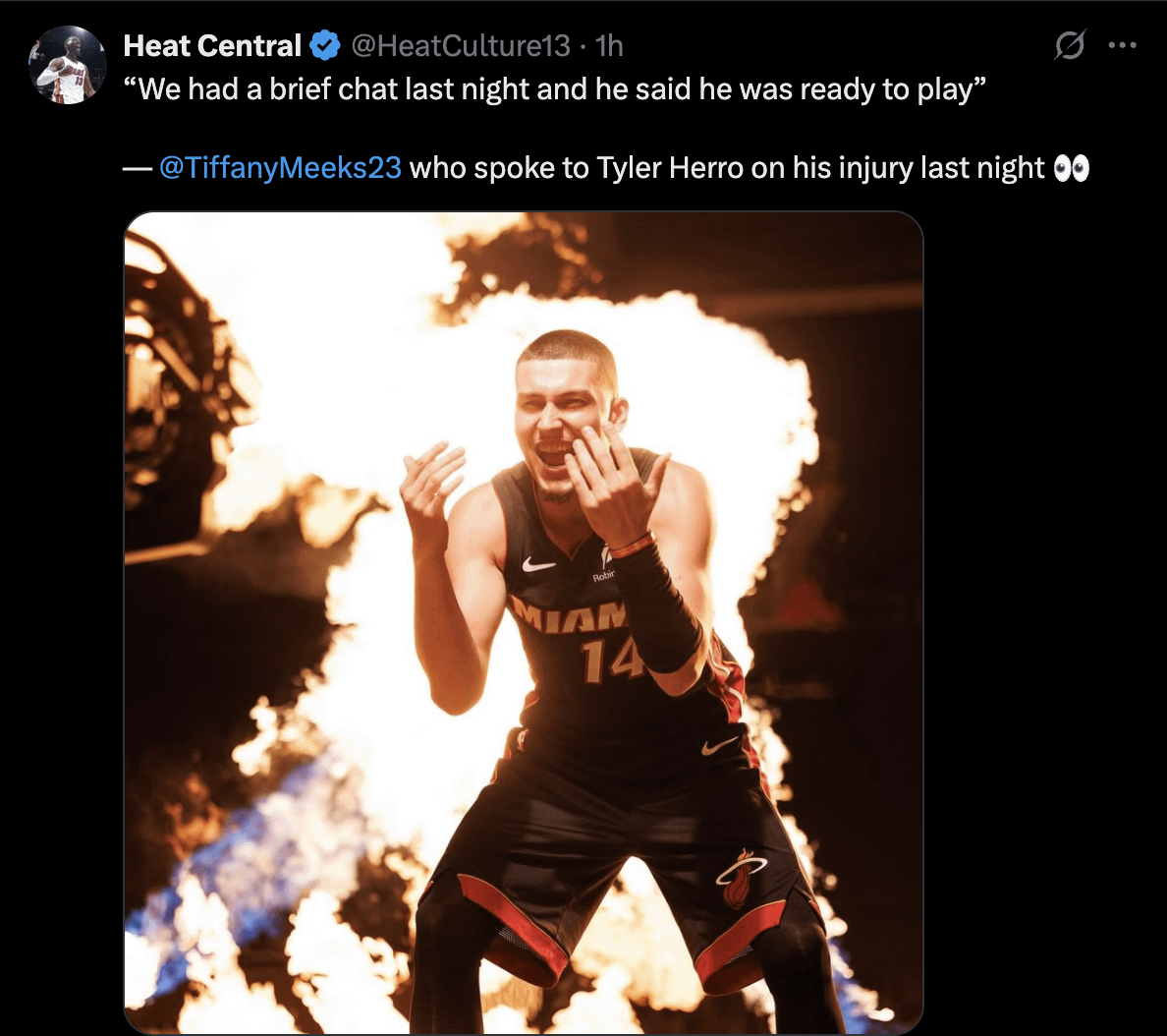 https://preview.redd.it/innuyzi3vh1g1.png?width=1186&format=png&auto=webp&s=d22a188dadec4bb804b8b9bd13a46013951b9603 # Herro on IG today: “Gettin’ right” Prediction: Bam and Herro comes back next game on Monday.