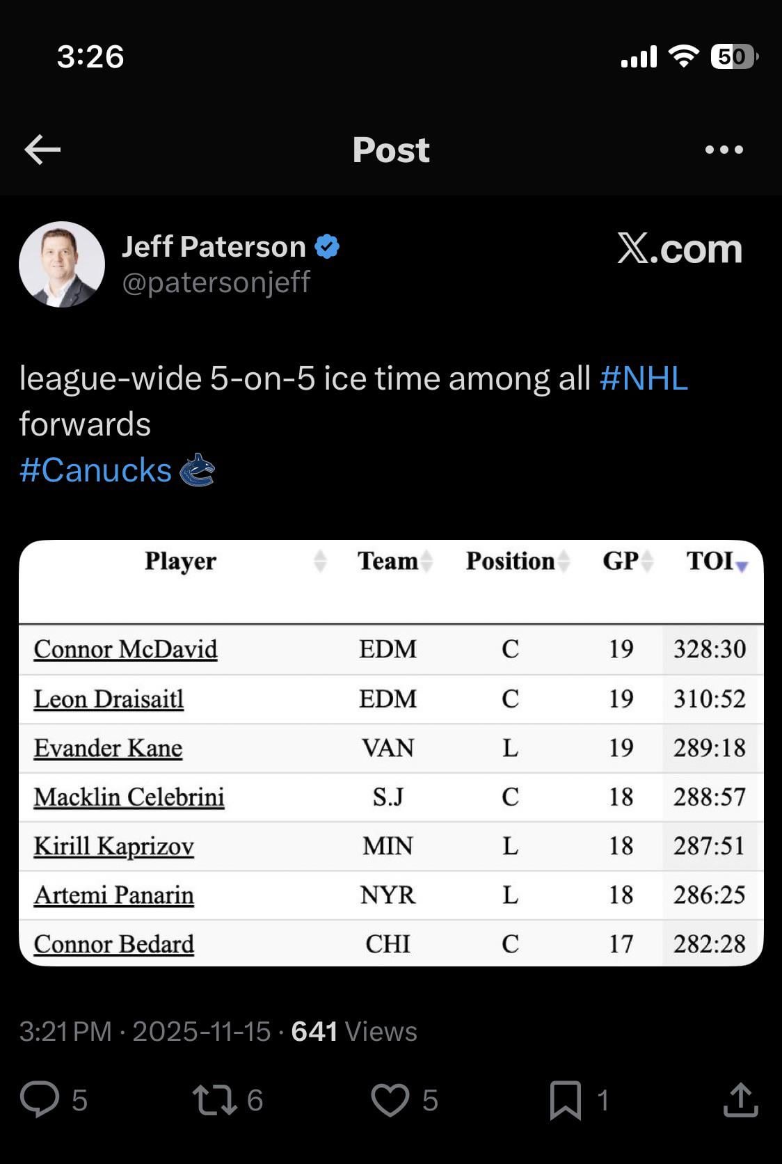 Some pretty funny over reactions to this. It’s not even surprising, he’s been playing wing on Petey and Garland’s line, so his ice time will be close to a 1st line wingers ice time. He doesn’t kill penalties and very rarely gets power play time, so his actual ice time is not that high.