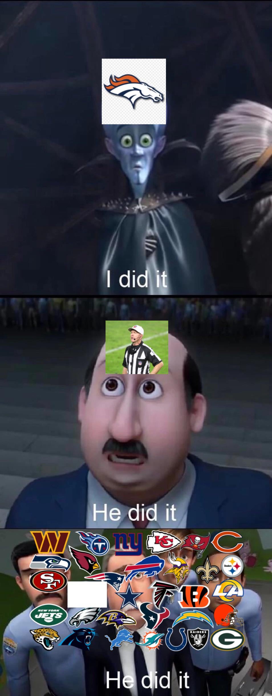 Swap rest of the NFL teams with refs. The guys in the final panel are supposed to be upset that Megamind beat Metro Man.