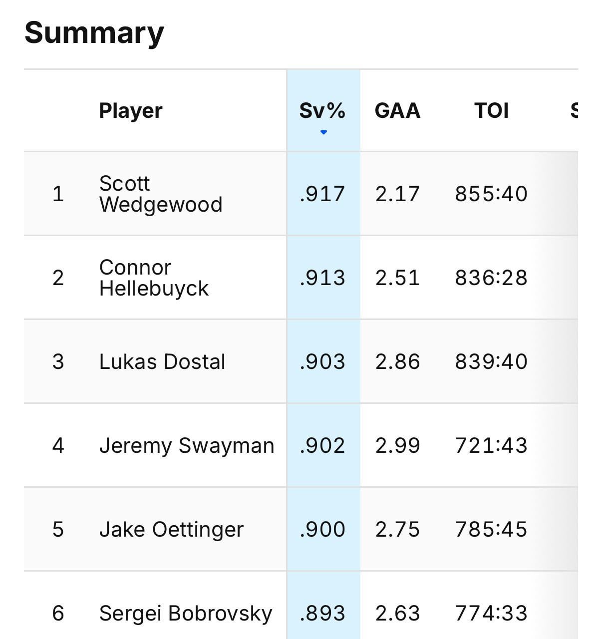 Wedgewood has been outstanding, no doubt. I’m curious what you sorted by to get these results. Quick has a .951. Wedgewood is 10th (technically 11th on this list but a better GAA) when I look up save percentage. https://www.quanthockey.com/nhl/seasons/nhl-goalies-stats.html