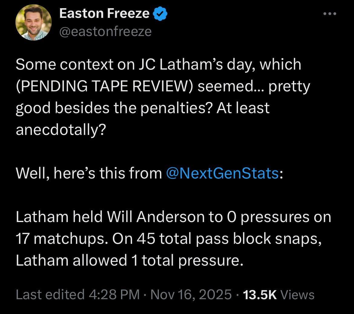 Besides the penalties, JC Latham had a good day against Houston, allowing only one pressure.