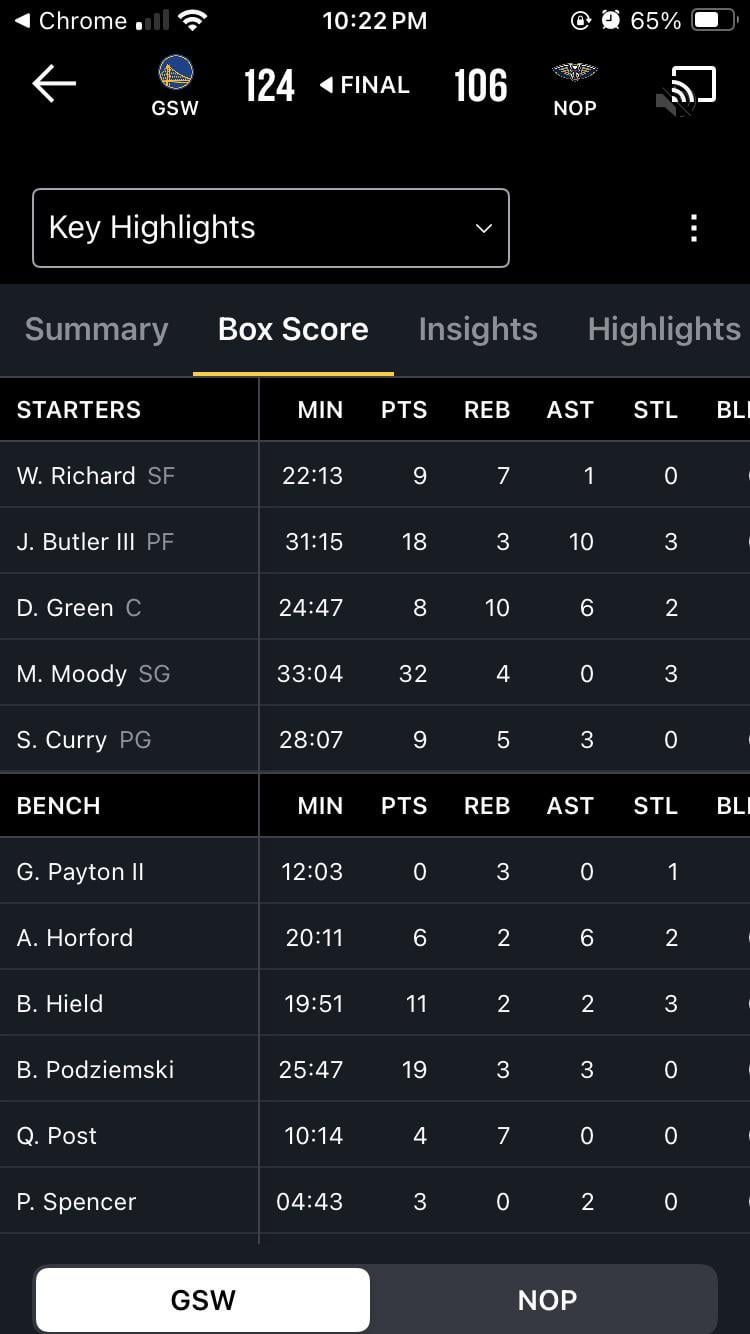 If you watched the game, the Pels sent 2 at Curry at all times and denied him any good looks. The result of that is they left either side wide open. That’s why Moody, Podz, Hield was feasting on those open shots. Interesting way to commit this much attention to Steph.