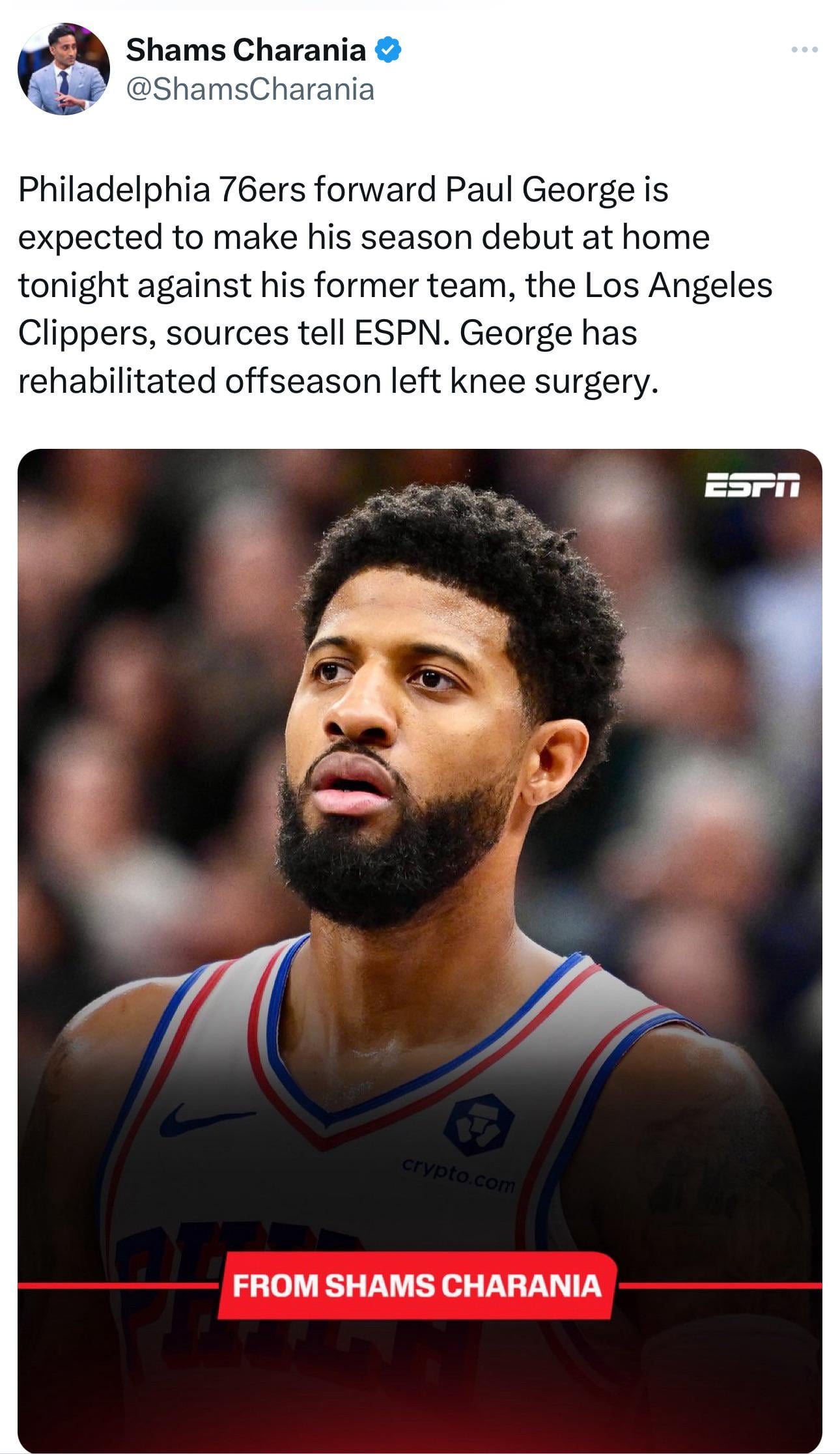 [Shams Charania] Philadelphia 76ers forward Paul George is expected to make his season debut at home tonight against his former team, the Los Angeles Clippers, sources tell ESPN. George has rehabilitated offseason left knee surgery.