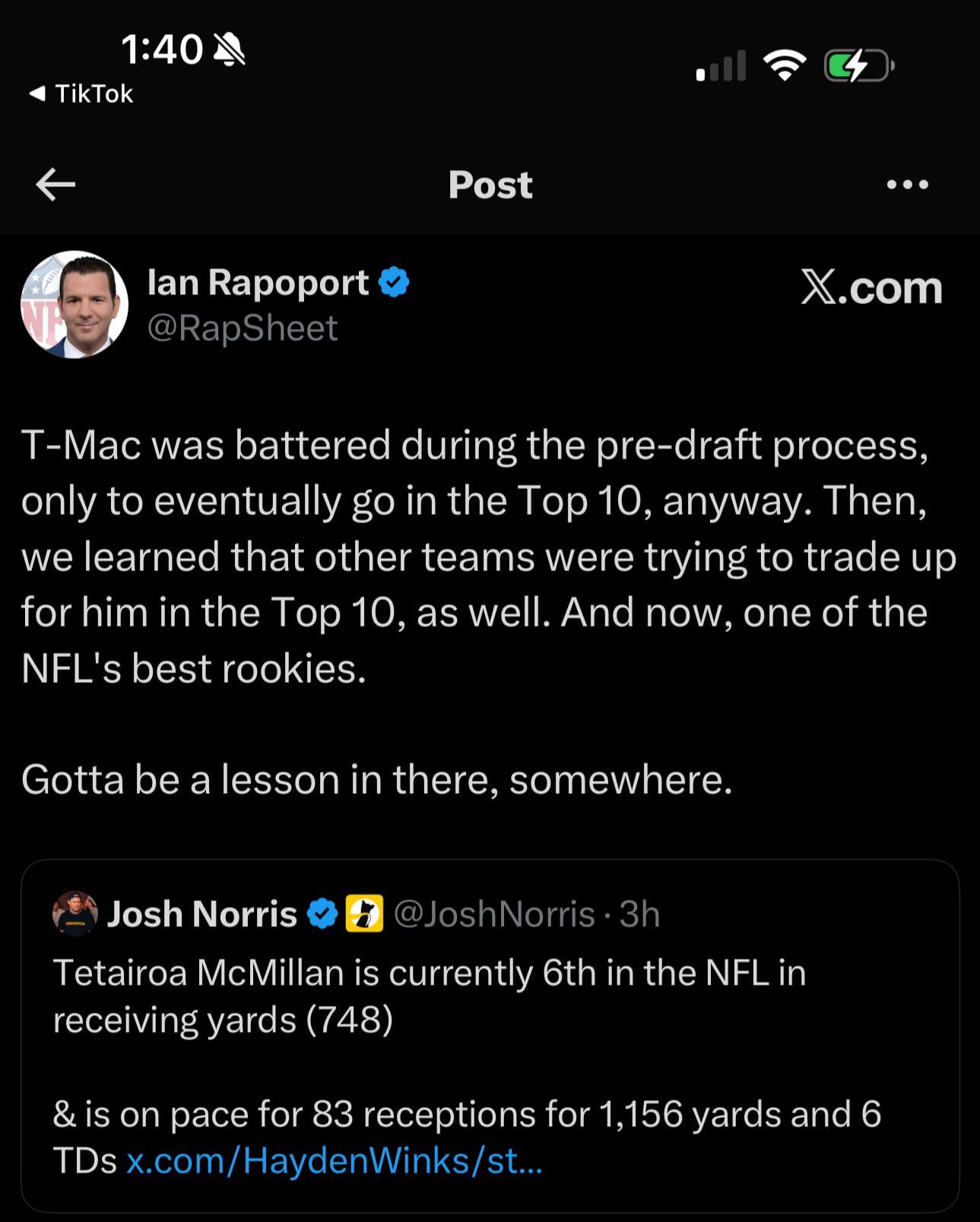 2. Todd McShay had him 50th, and Todd is not a stupid guy. He was 100% fed some bad information about TMac (as were a lot of people in media) and a perception was formed of him that just doesn’t match reality.