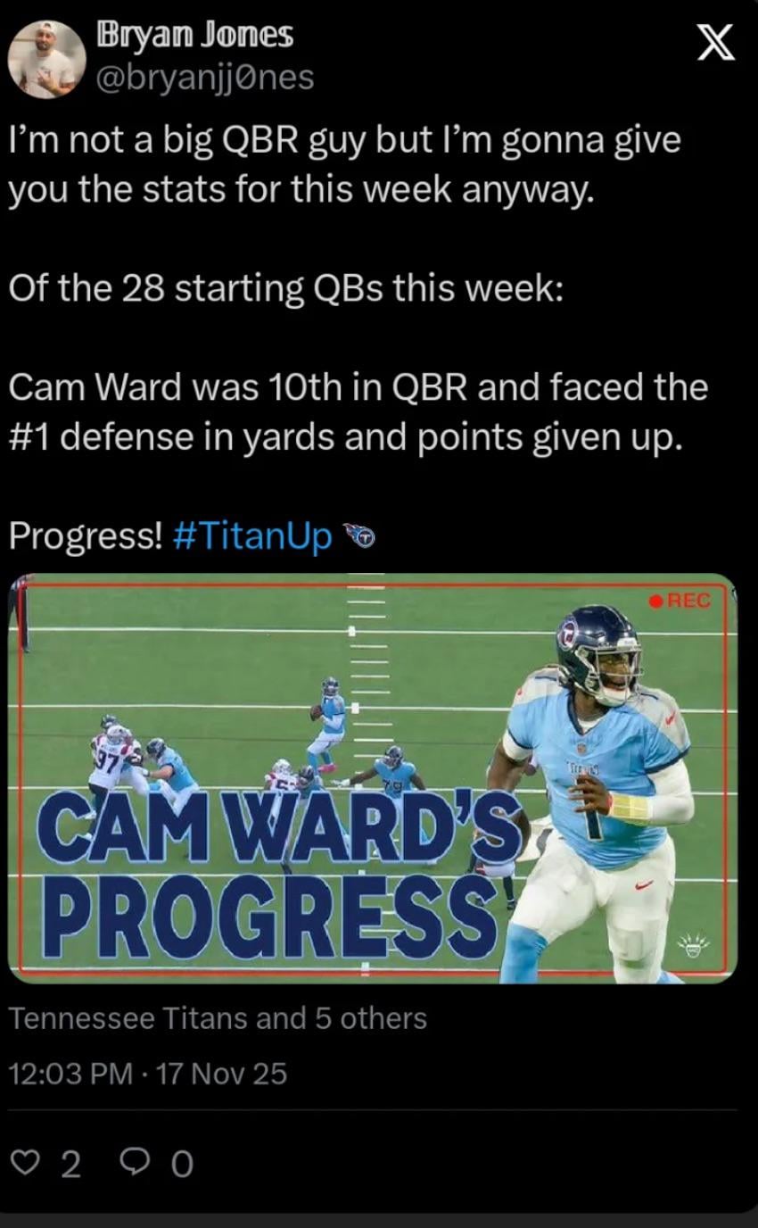 Against the #1 defense, Cam Ward finished 10th in QBR this week