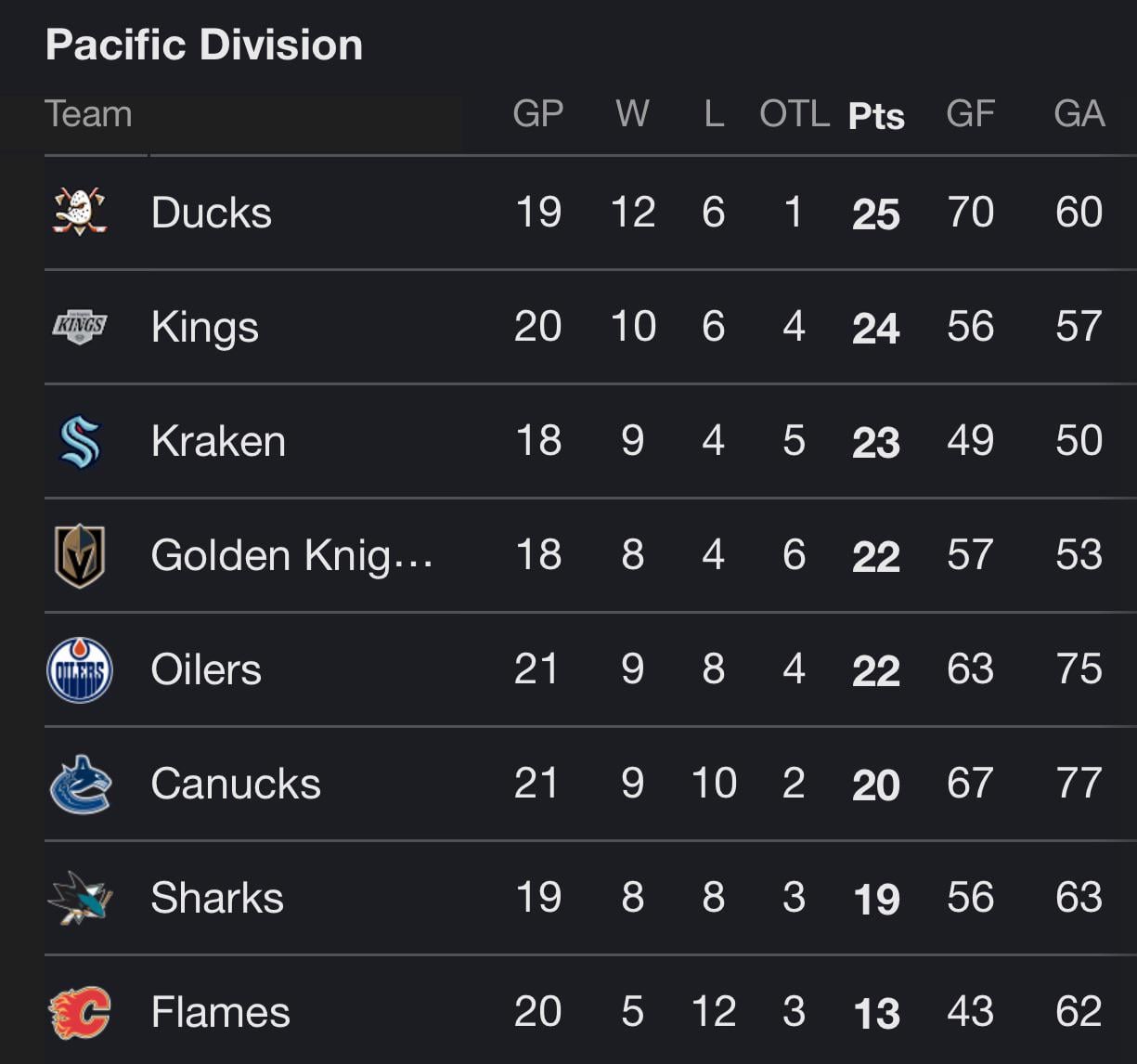 The Kings are in 2nd but they only have 10 wins in 20 games. That means they’ve lost 10 games as well, they’ve just been lucky enough to get four loser points along the way. Every team in the Division has lost half of their games or more except the Ducks who have 12 wins in 19 games.
